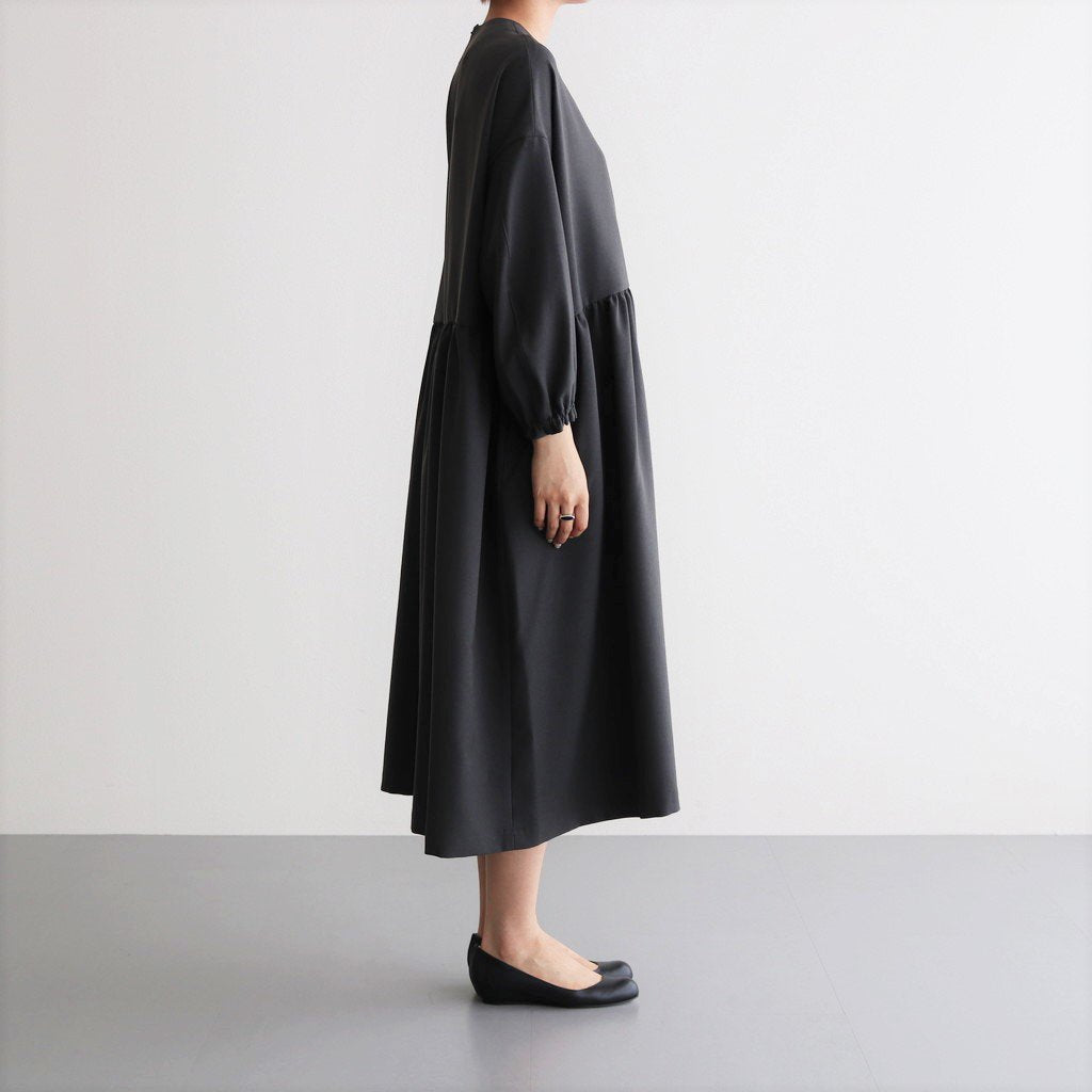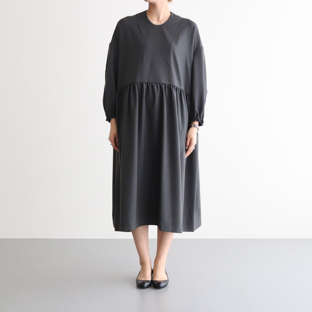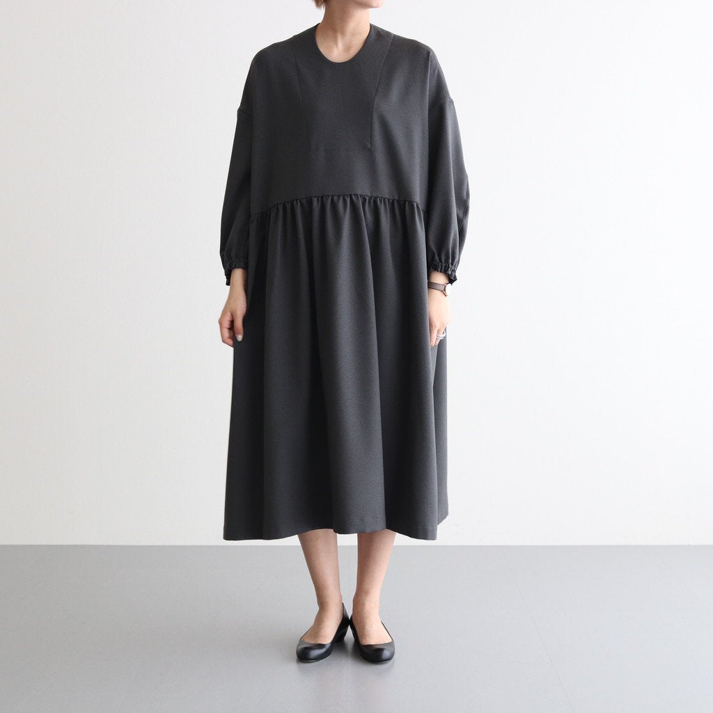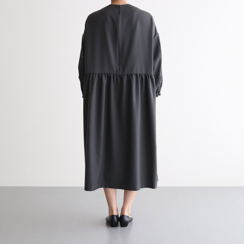 Over silhouette dress in polyester flannel twill textile. Woolly polyester yarns are used to create a supple, flannel-like texture. The yarn itself has stretch properties, and since polyurethane is not used, the finished product is lightweight with little risk of deterioration. Although the fabric is not product-washed, it can be washed at home because of its stable fastness and physical properties. One of the characteristics of this soft material is that it has a moderate fall and flex when worn. The silhouette is finished in a fairly loose over-fit, with countless gathers at the waist. The silhouette is finished with a lot of fabric used in the lower half of the body, allowing you to enjoy a beautiful drape. The armholes are designed to be a little loose, and the sleeves are fastened with ribs. The neck is designed with a concealed zipper for ease of covering when wearing, and a slit pocket is designed at the gathered part under the seam.