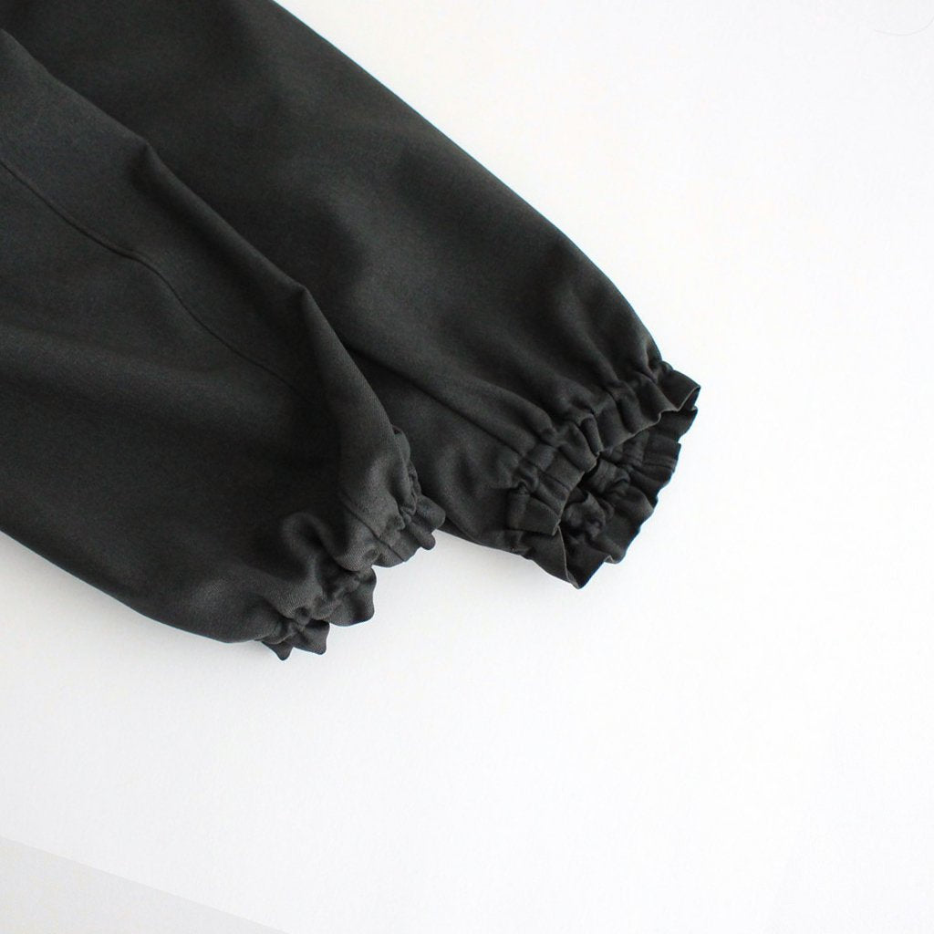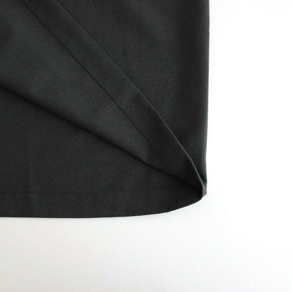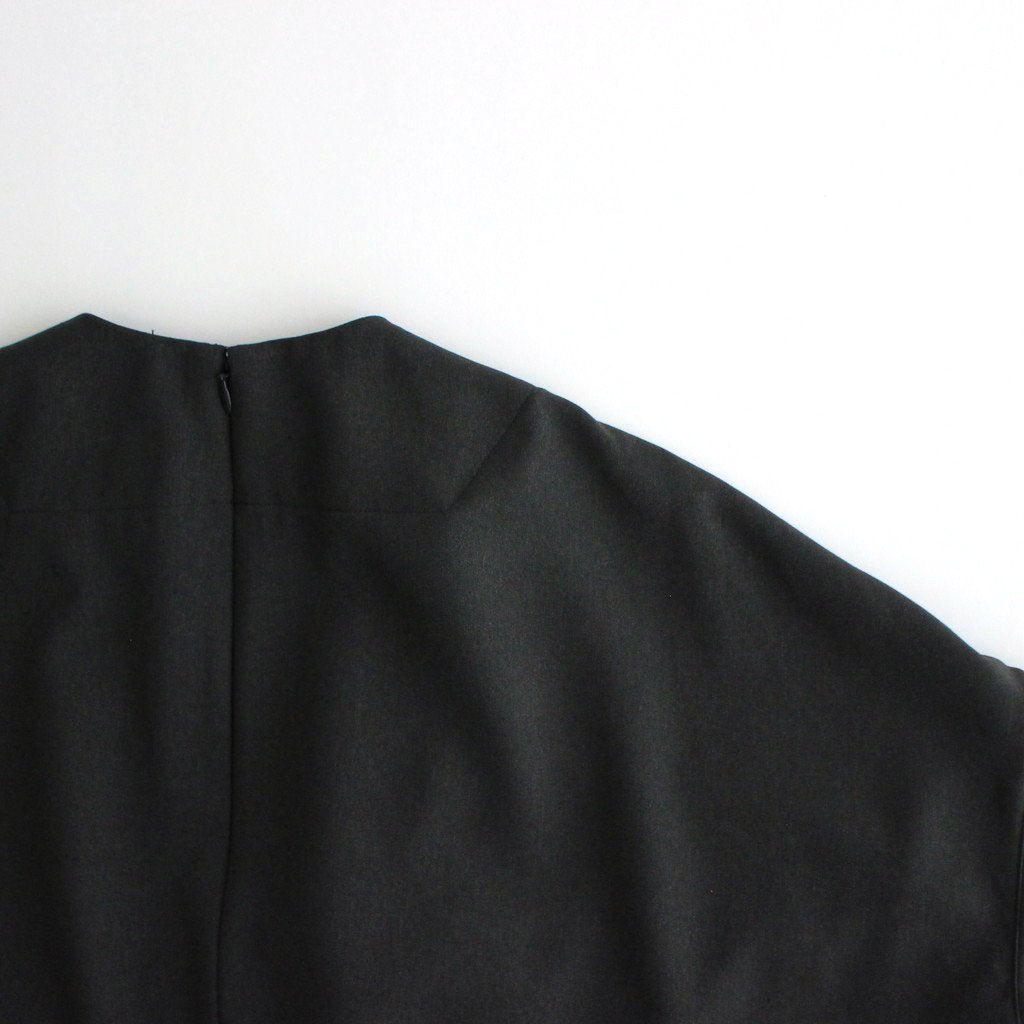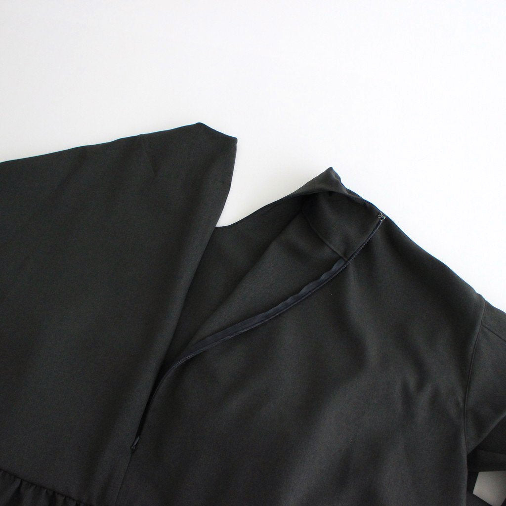 Over silhouette dress in polyester flannel twill textile. Woolly polyester yarns are used to create a supple, flannel-like texture. The yarn itself has stretch properties, and since polyurethane is not used, the finished product is lightweight with little risk of deterioration. Although the fabric is not product-washed, it can be washed at home because of its stable fastness and physical properties. One of the characteristics of this soft material is that it has a moderate fall and flex when worn. The silhouette is finished in a fairly loose over-fit, with countless gathers at the waist. The silhouette is finished with a lot of fabric used in the lower half of the body, allowing you to enjoy a beautiful drape. The armholes are designed to be a little loose, and the sleeves are fastened with ribs. The neck is designed with a concealed zipper for ease of covering when wearing, and a slit pocket is designed at the gathered part under the seam.