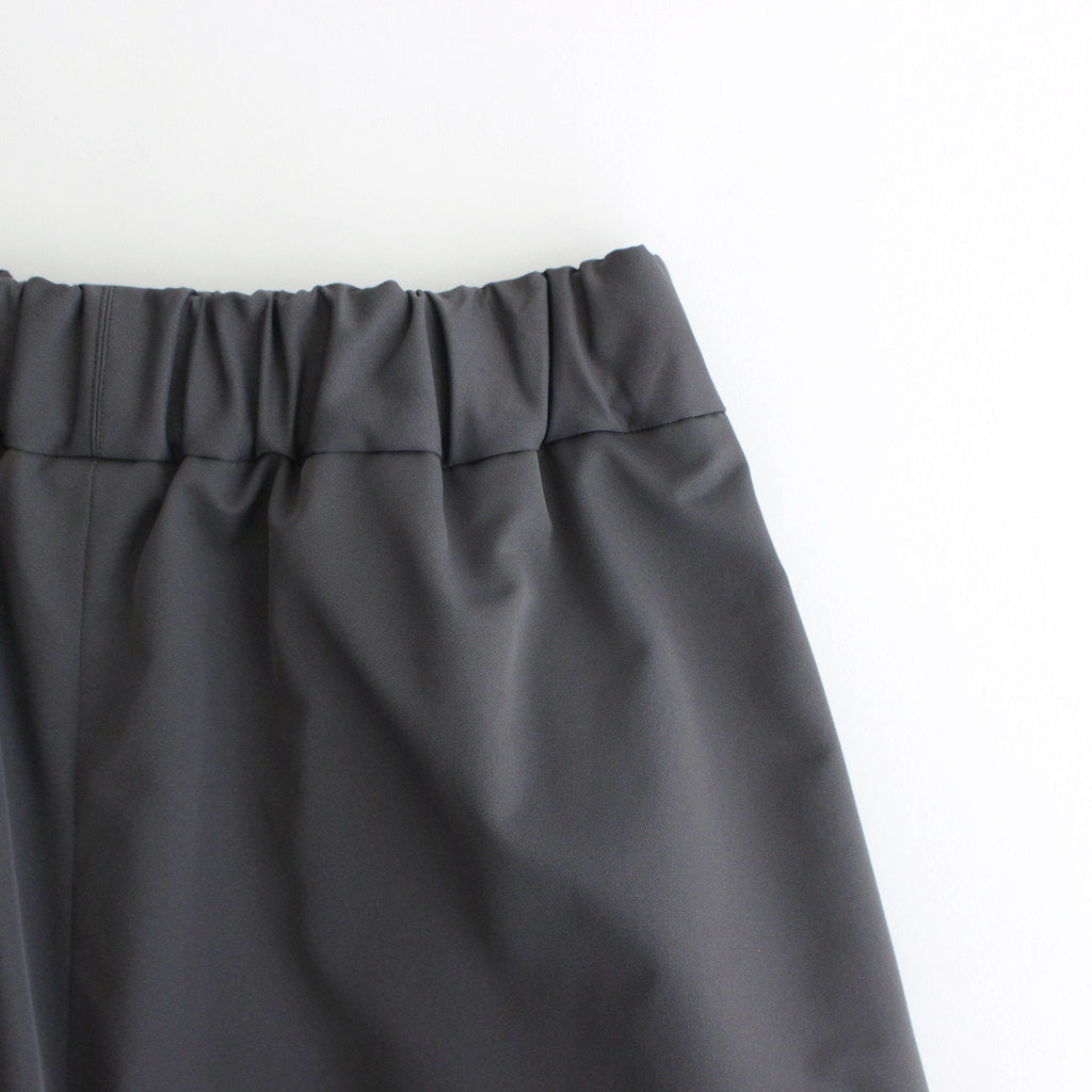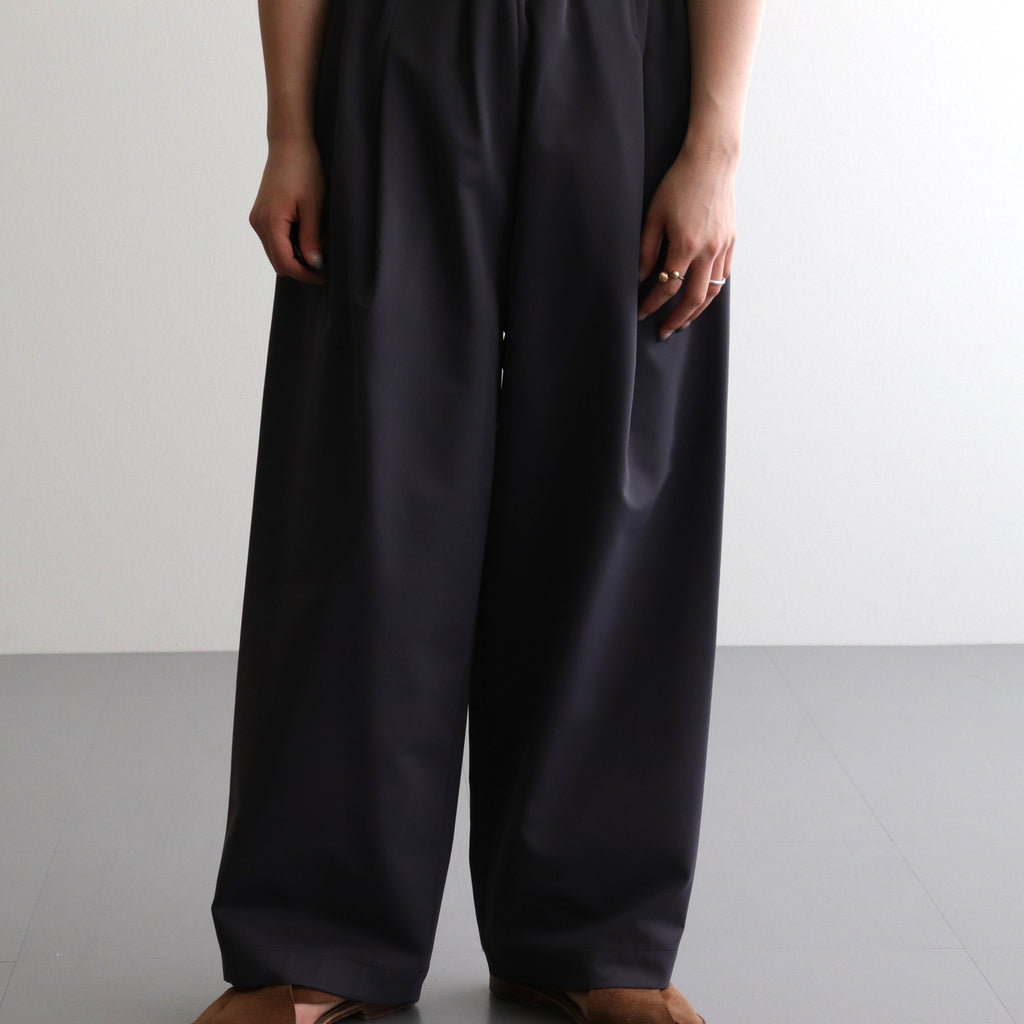 These wide straight easy pants have a deep rise, ample room around the thighs, and are slightly tapered towards the hem. A tuck around the waist creates a voluminous silhouette. The design emphasizes the three-dimensional cylindrical shape by eliminating the outer stitching. Pockets are designed on both the front and back sides. The waist can be precisely adjusted with elastic and drawstring.
