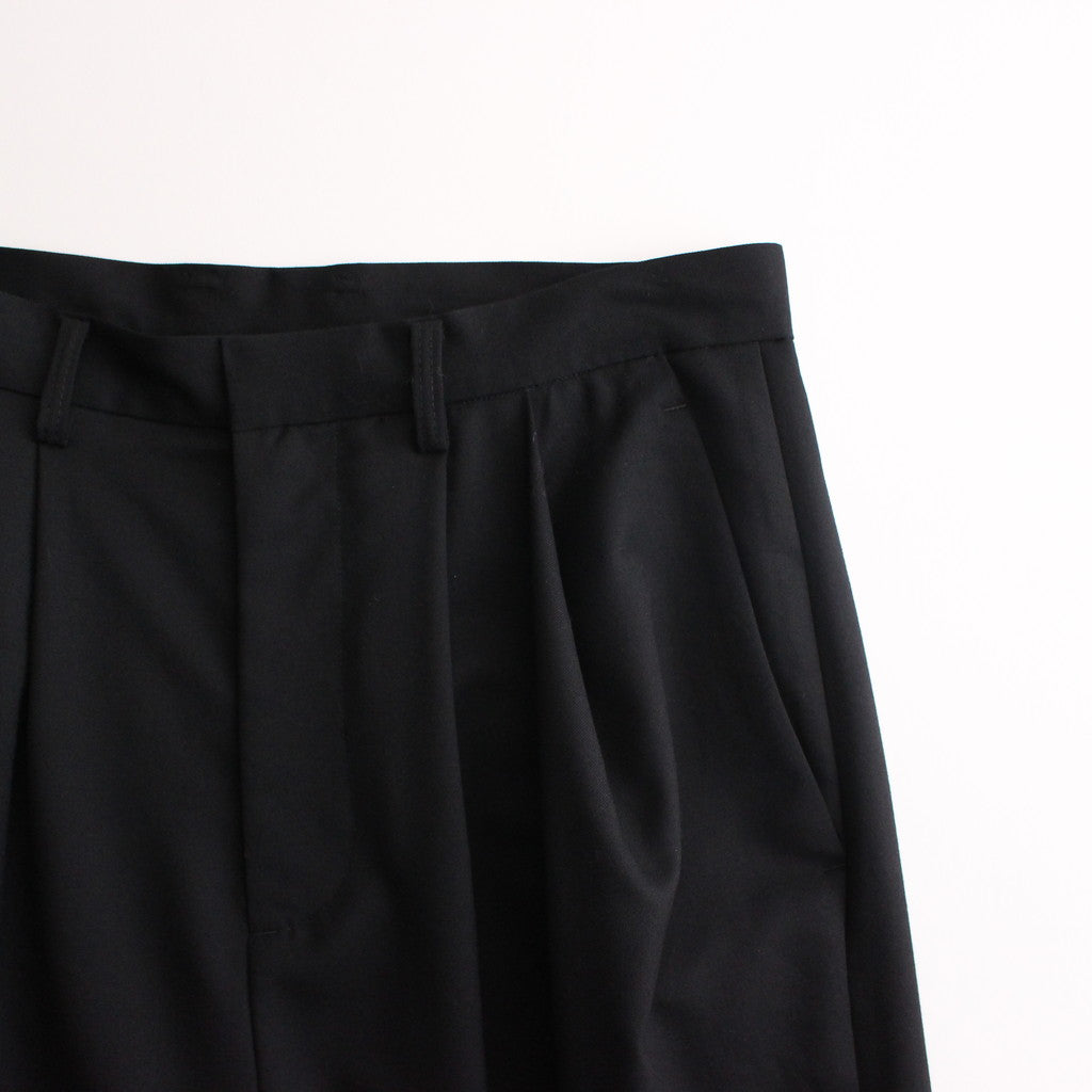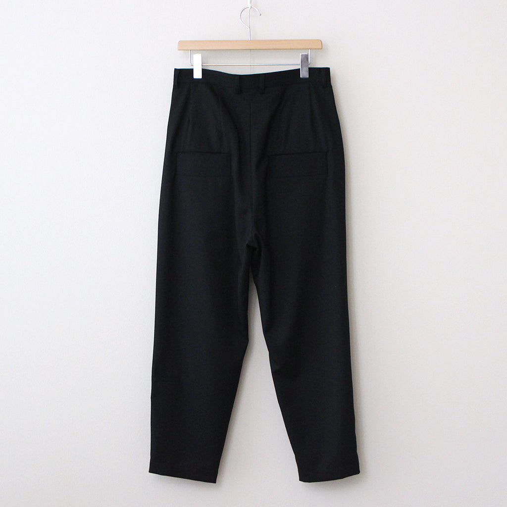 A tapered silhouette with plenty of room around the thighs and a tight hem . Two tucks at the front and darts at the back give a sense of volume around the waist. The tapered hem emphasizes the silhouette and keeps it snug without being too loose. There are slash pockets at the front and low pockets at the back with wide welts for a unique look. Zip fly. There is a small pocket at the back hem, which is an icon of Dulcamara.