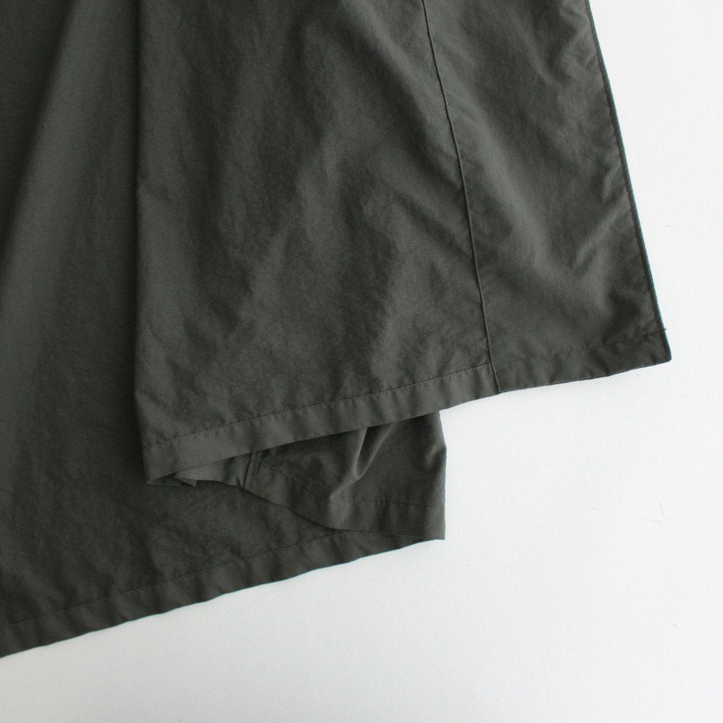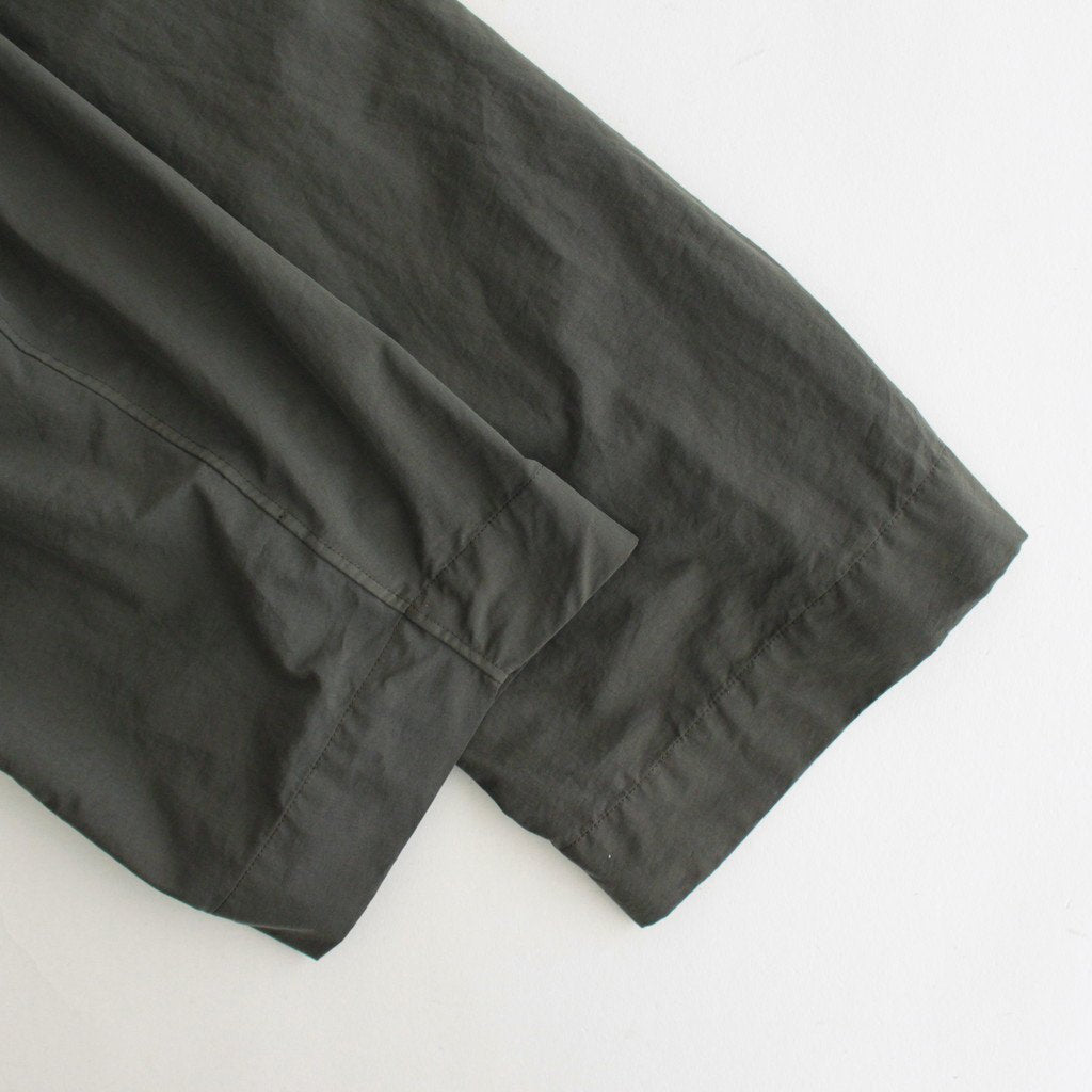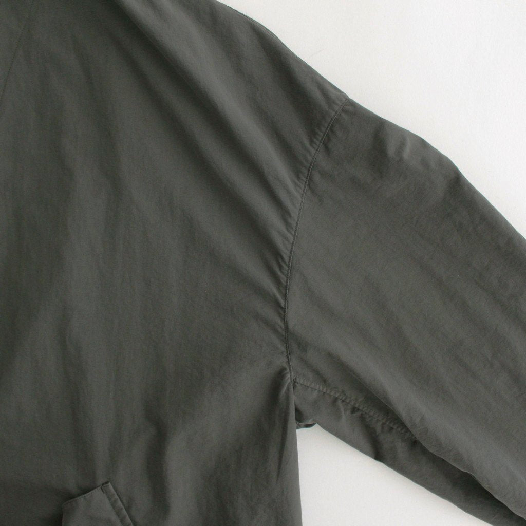・Material and fabric: "Nylon Tussar/Garment Dyed" textile is used. Tussar is a type of plain weave fabric that uses slightly thicker threads for the weft to create a horizontally ribbed look. Because it is a tussah weave, it has slight horizontal ribs and is brushed, giving it a soft touch even though it is nylon. The fabric feels puffy and gives out light volume. As the product is dyed, there may be large puckering, the color may not be applied to the seams such as rolled seams, and the color may appear slightly uneven, but this is due to the nature of this fabric. This is a feature of