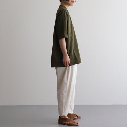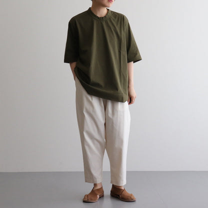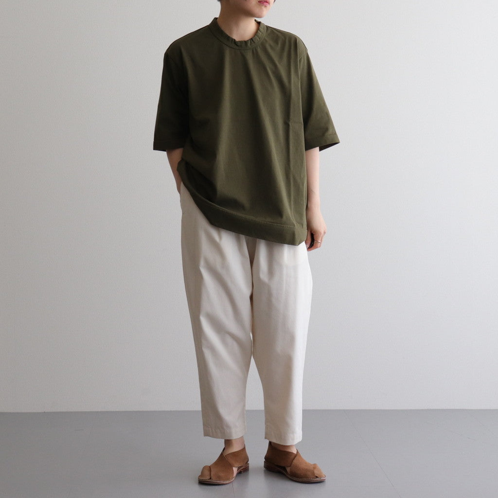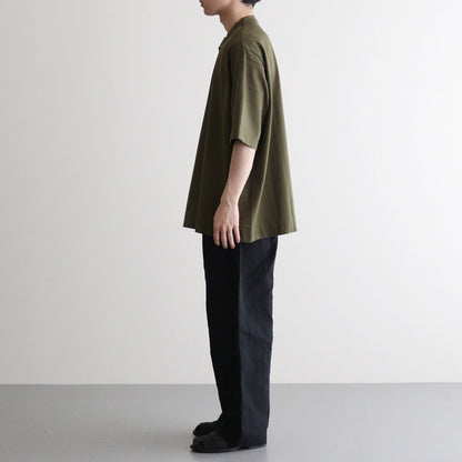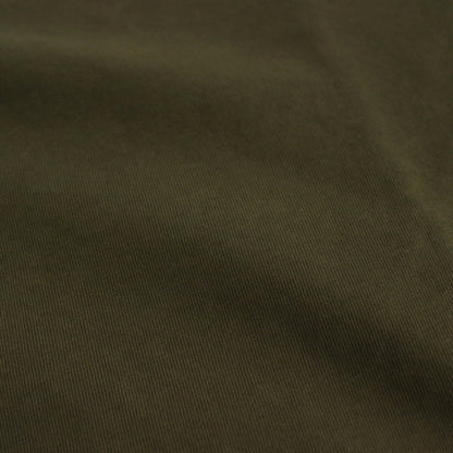 This fabric is made by knitting two tightly twisted 32-count cotton single yarns together in a jersey weave. It has a dry texture unique to tightly twisted cotton yarn and has a moderate thickness and texture. It is finished with a natural texture by washing and tumble drying.