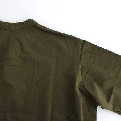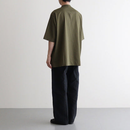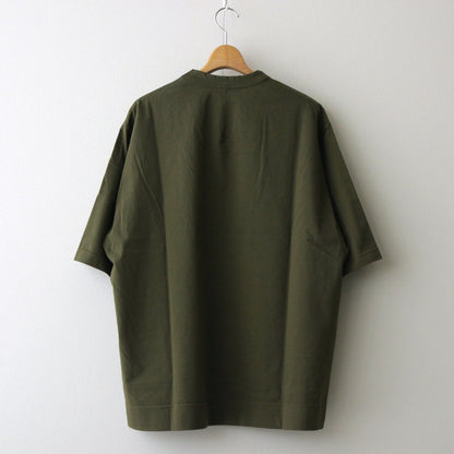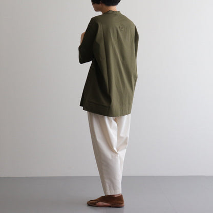 A regular fit crew neck cut and sew with a moderate amount of room. The width of the body is slightly wider and the sleeves are slightly longer at 5/4 length for a relaxed silhouette.