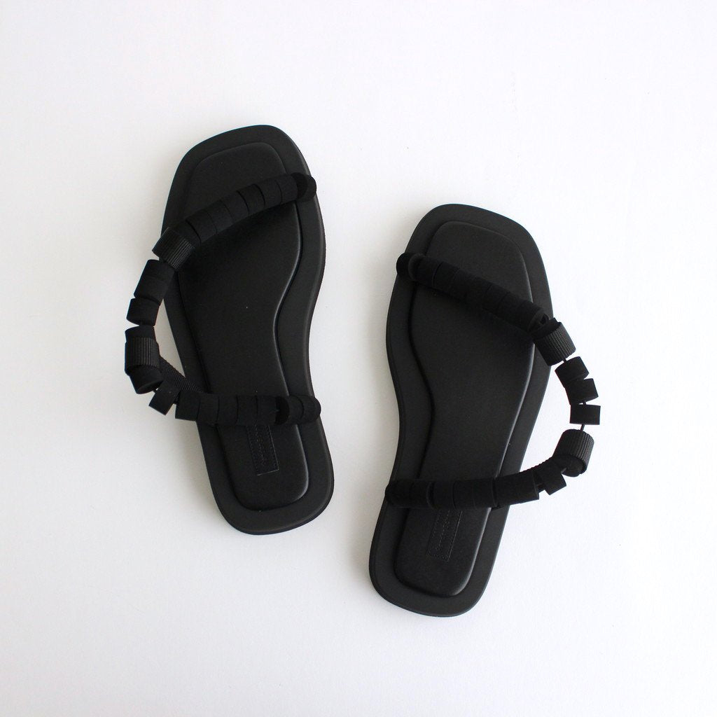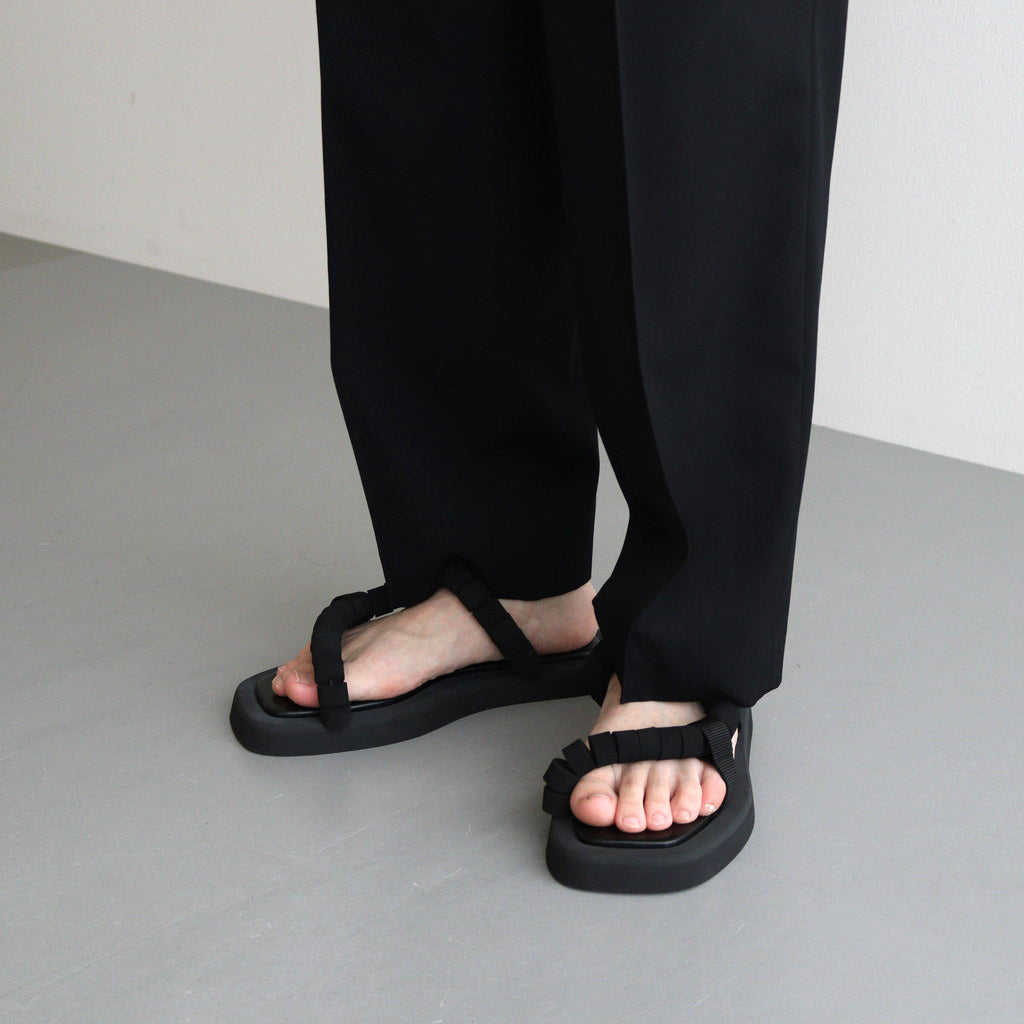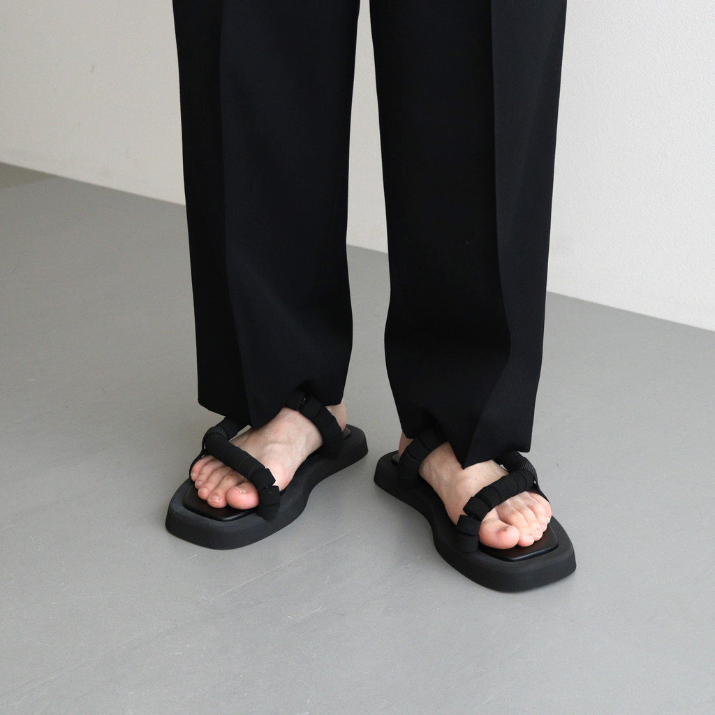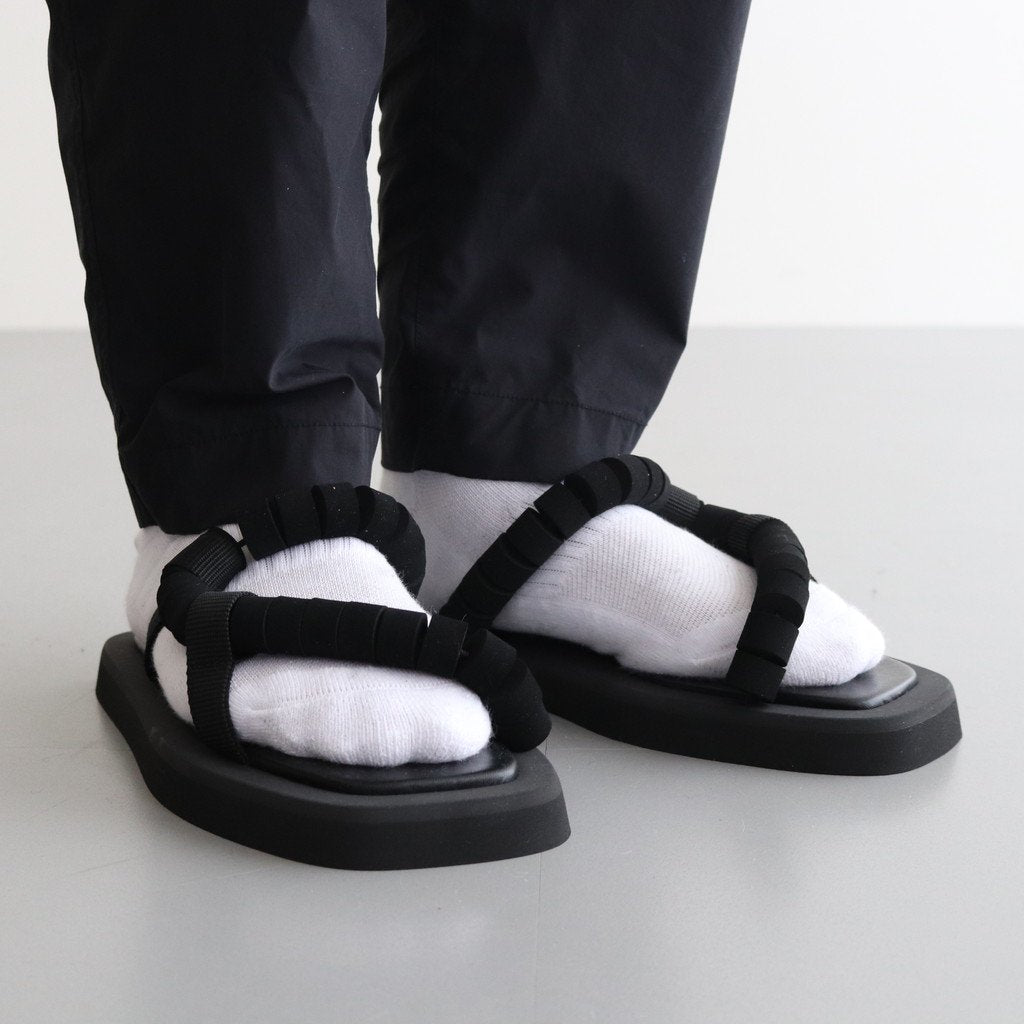 Hender Scheme sandals "CURVACEOUS". Neoprene material is used for the upper cushioning material. The unique shape is inspired by the lane rope I saw while in the pool with my kids. Neoprene is a high-grade material that is scratch resistant and weather resistant, yet extremely lightweight, cushioning, and flexible. It combines comfortable cushioning and safety, so it won't cause pain and provides a soft cushion when walking. The footbed and thong are made of high-quality cow leather material with a fine grain texture. It is supple and soft, and features a moist texture unique to leather. The outsole uses EVA (ethylene and vinyl acetate/EVA resin). Although it is a combination of different materials, the entire sandal is unified in black, giving it an elegant and modern feel. These sandals can be worn in a variety of situations, whether you wear denim or slacks, bare feet or socks.