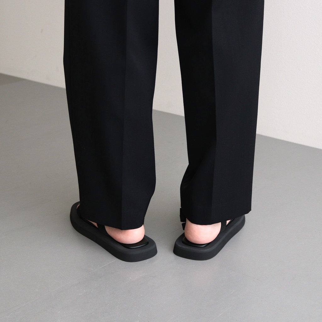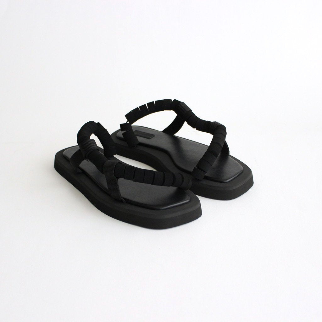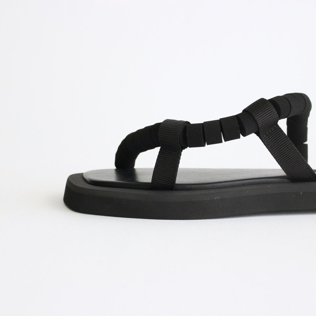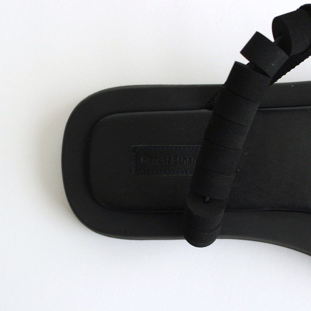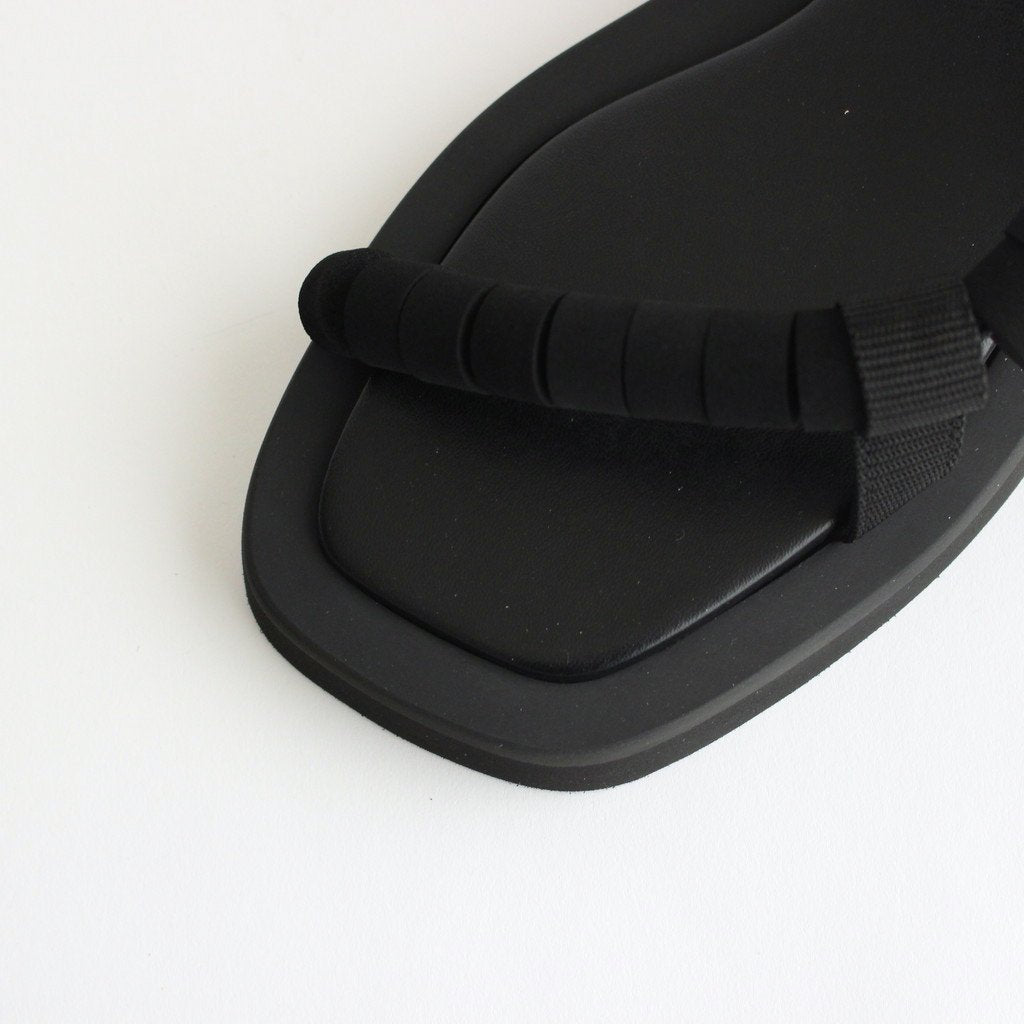 Hender Scheme sandals "CURVACEOUS". Neoprene material is used for the upper cushioning material. The unique shape is inspired by the lane rope I saw while in the pool with my kids. Neoprene is a high-grade material that is scratch resistant and weather resistant, yet extremely lightweight, cushioning, and flexible. It combines comfortable cushioning and safety, so it won't cause pain and provides a soft cushion when walking. The footbed and thong are made of high-quality cow leather material with a fine grain texture. It is supple and soft, and features a moist texture unique to leather. The outsole uses EVA (ethylene and vinyl acetate/EVA resin). Although it is a combination of different materials, the entire sandal is unified in black, giving it an elegant and modern feel. These sandals can be worn in a variety of situations, whether you wear denim or slacks, bare feet or socks.
