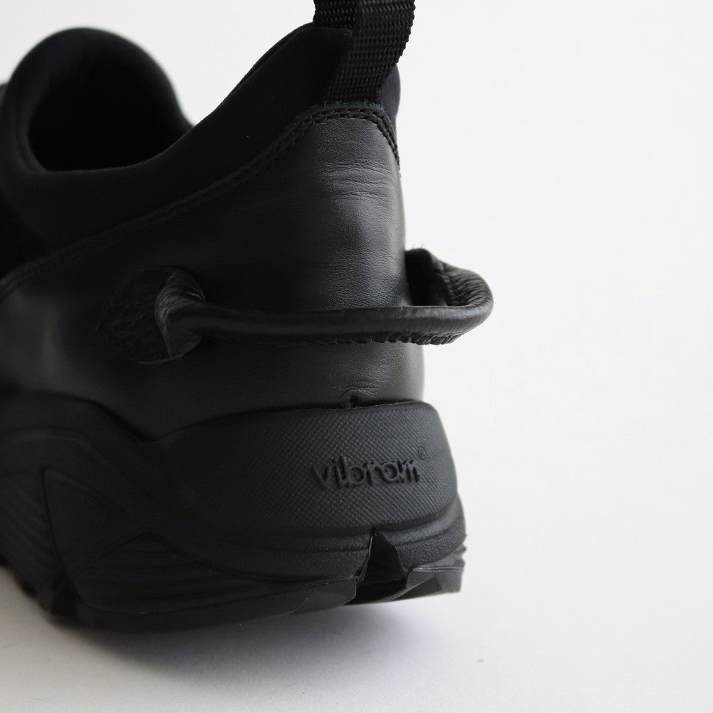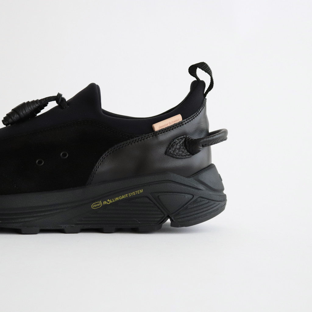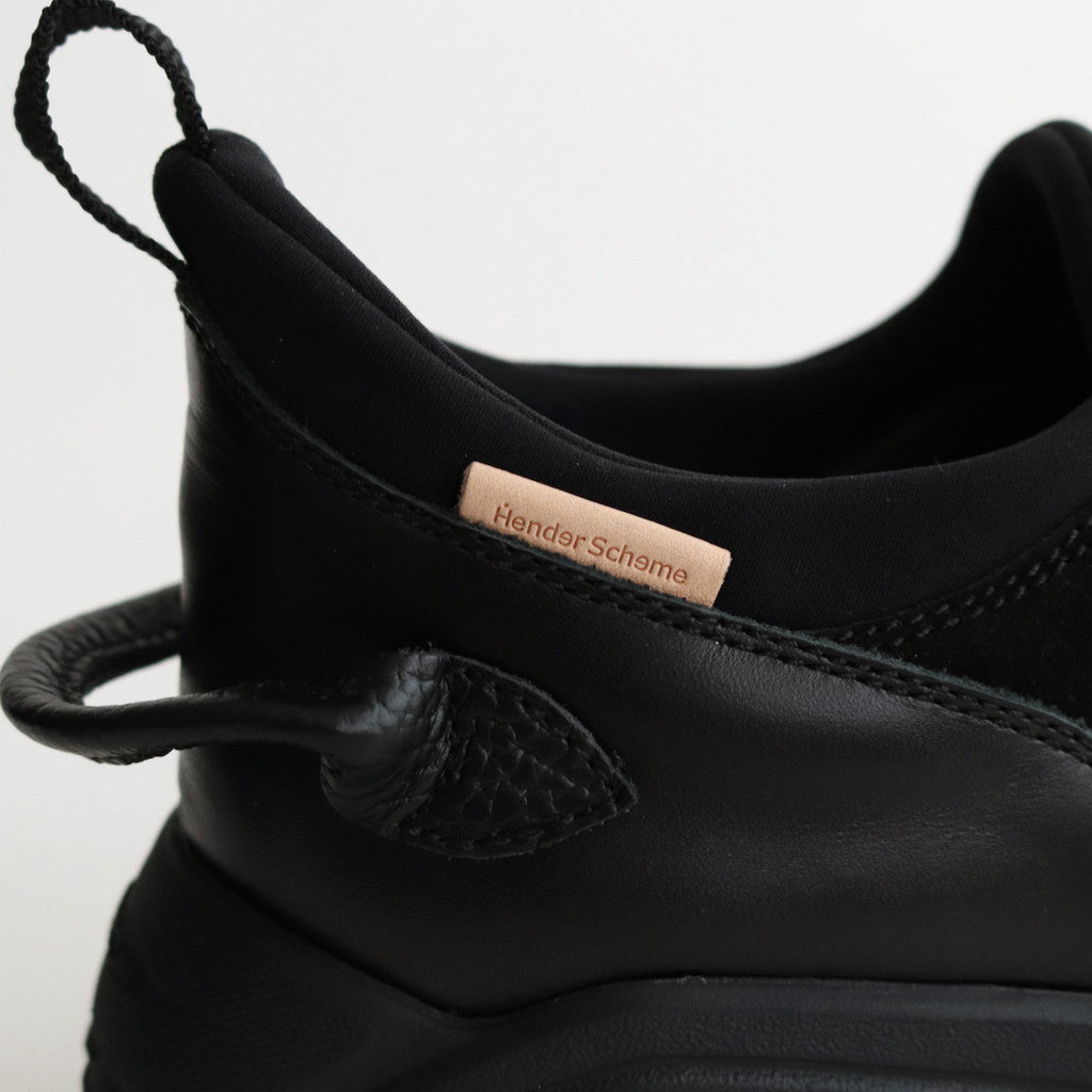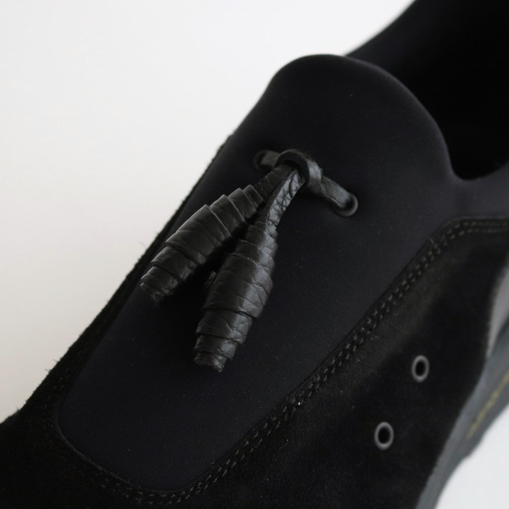 A pair of shoes with a hybrid look, combining a combination upper of leather and neoprene with a voluminous Vibram sole. The design is reminiscent of the mock-type mountain shoes that were popular in the late 90's. The instep part has a tassel part wrapped in leather, giving it a playful design typical of Enderschema.