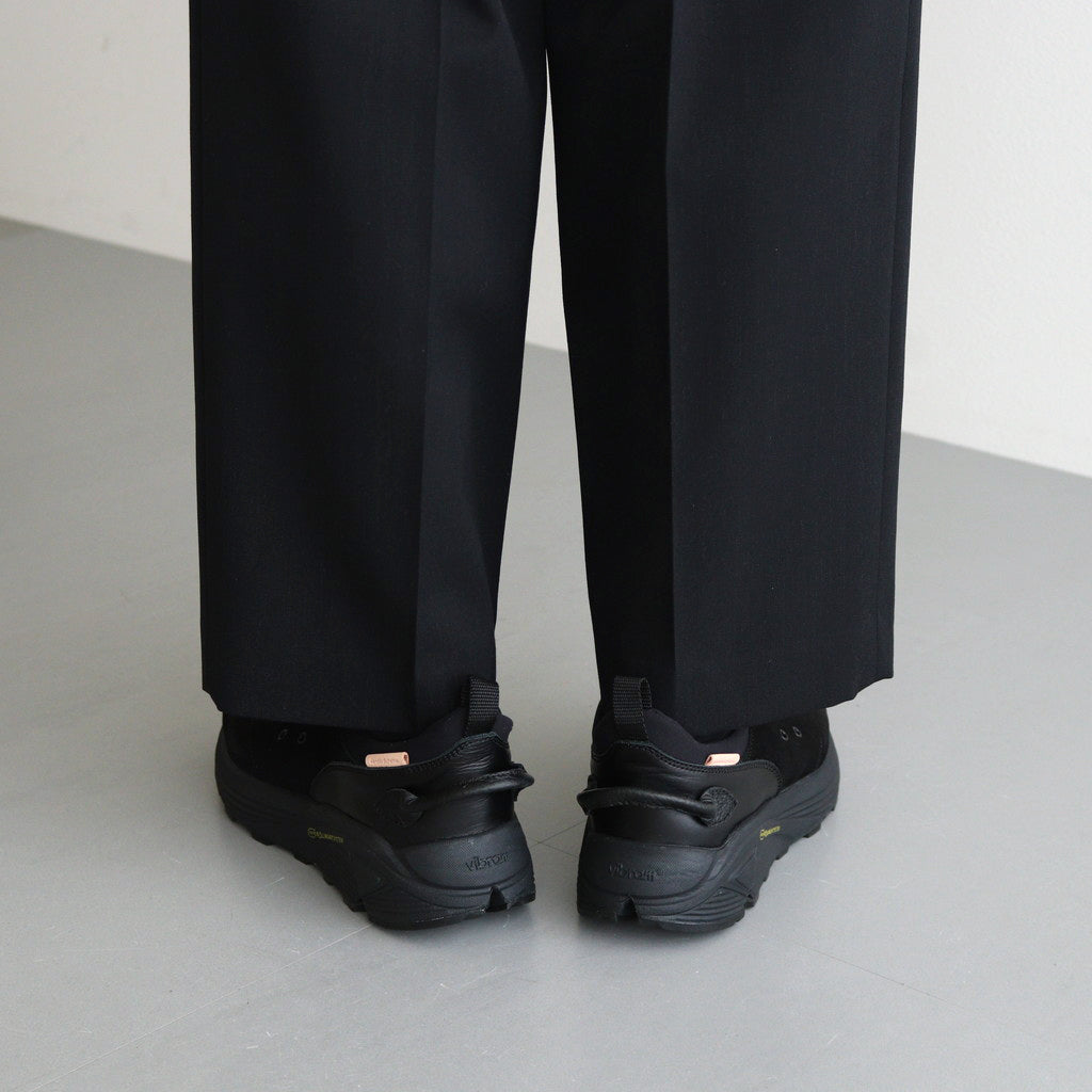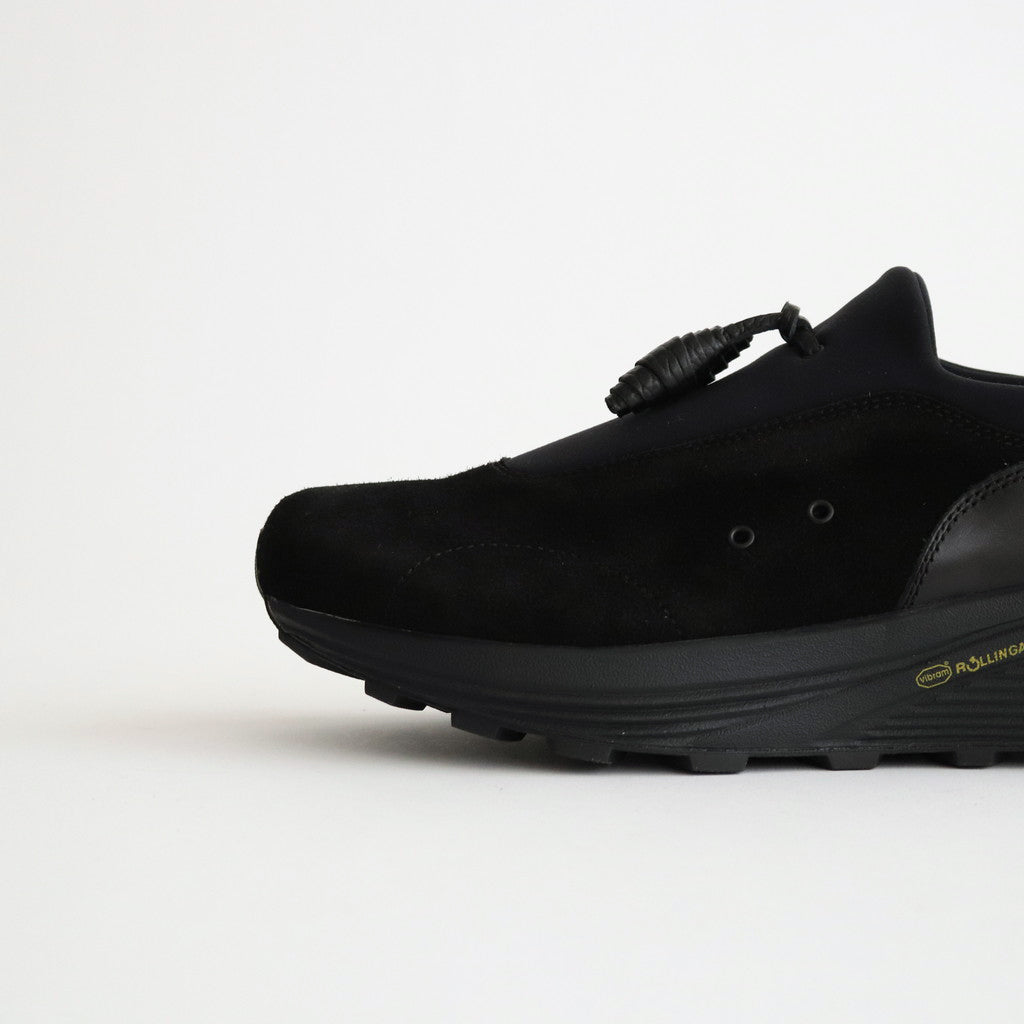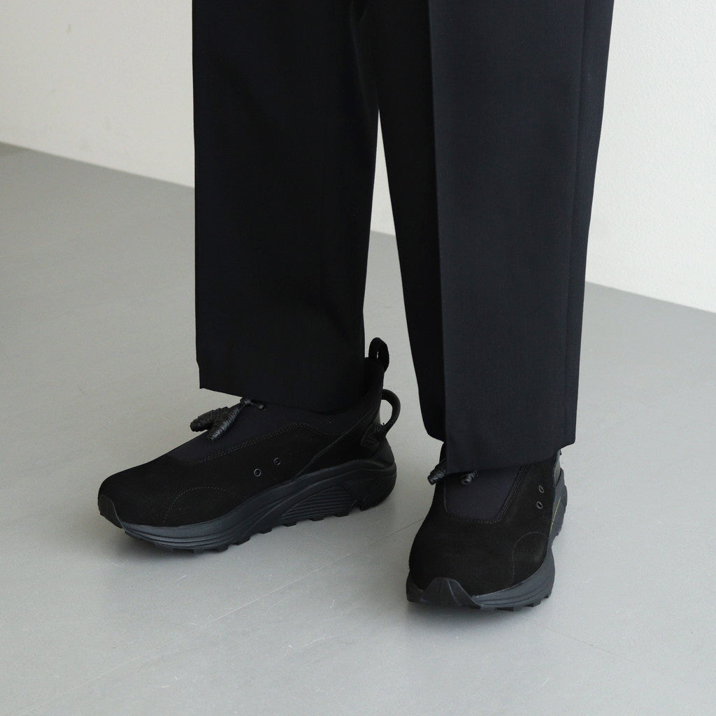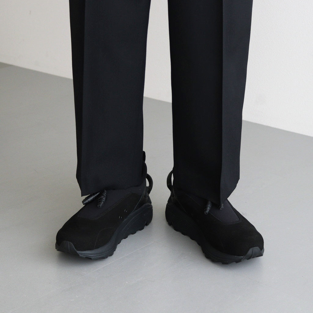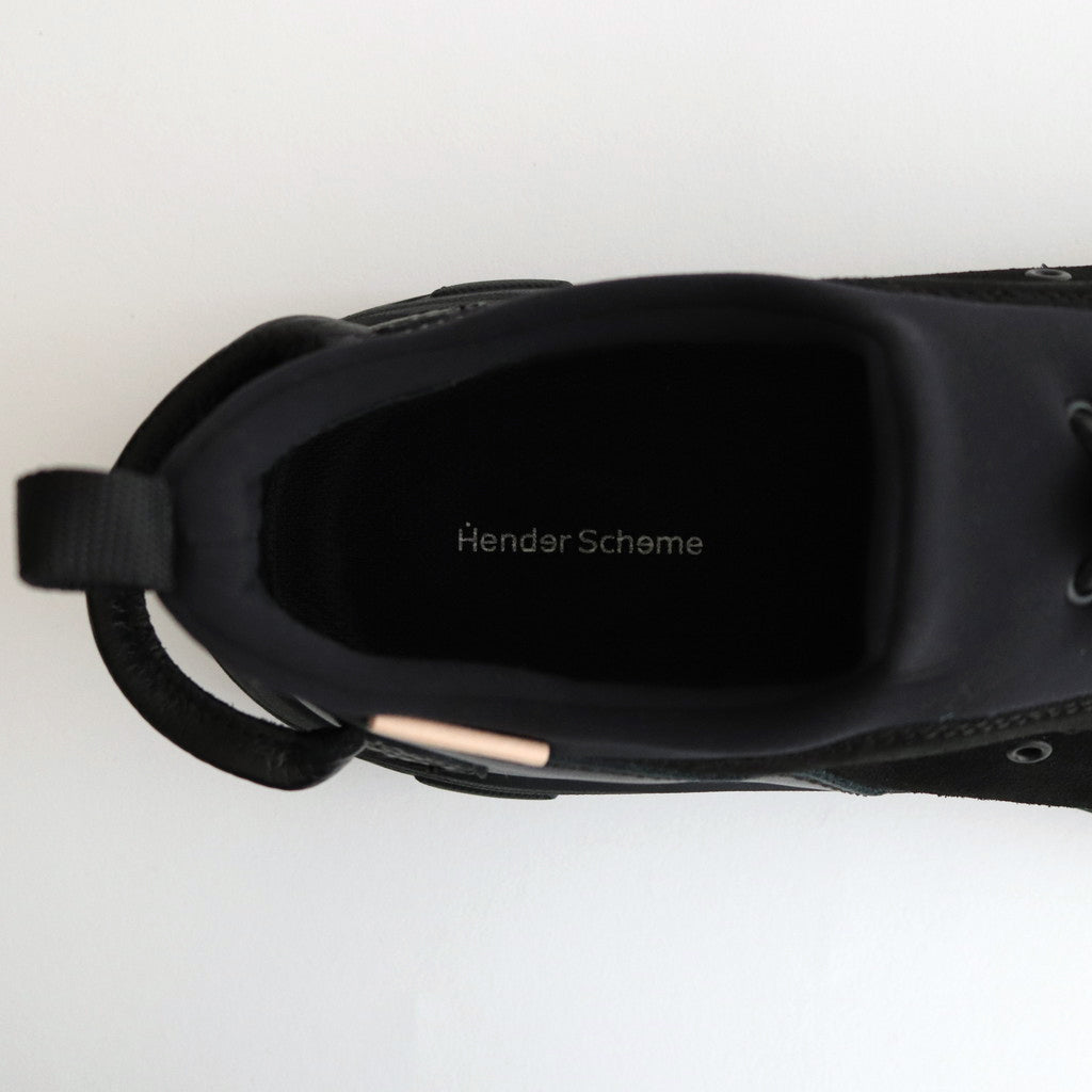 A pair of shoes with a hybrid look, combining a combination upper of leather and neoprene with a voluminous Vibram sole. The design is reminiscent of the mock-type mountain shoes that were popular in the late 90's. The instep part has a tassel part wrapped in leather, giving it a playful design typical of Enderschema.