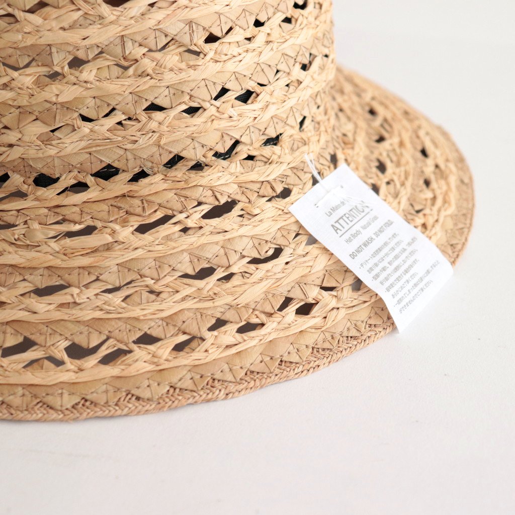 Made from a combination of hand-knitted coconut palm triangular braid material and openwork raffia braid, also hand-knitted. Characterized by the strength of the material and vintage look. The openwork pattern casts a shadow on your face like sunlight filtering through the trees.