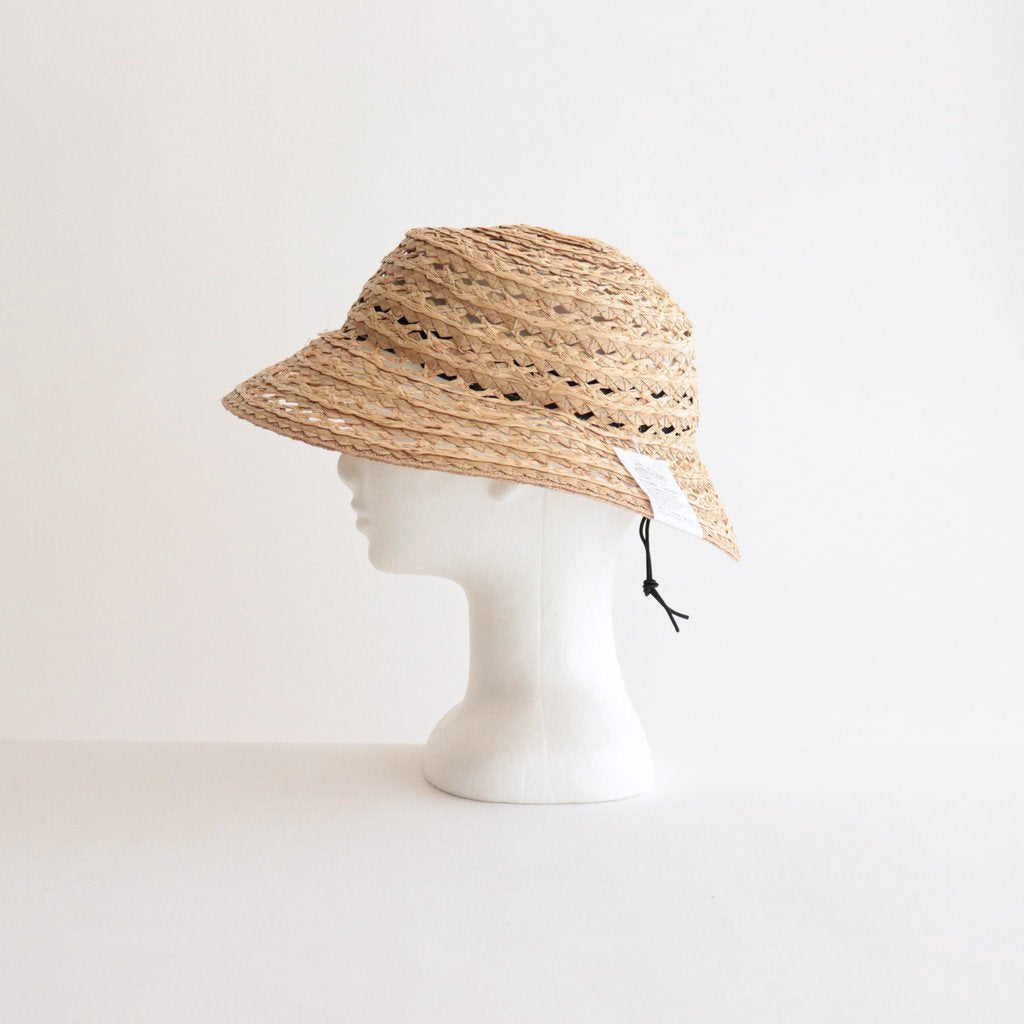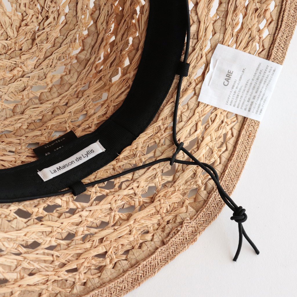 The "YANE" hat has less contact with the head, giving you a floating feel. As the name suggests, it is designed to resemble a roof over your head. The body is larger than the head, but the size can be adjusted with the rubber attached to the inside. It allows air to pass through and does not feel constricting, making it a comfortable item even in the spring and summer seasons. There are loops on both sides of the inside for passing ribbons through, so if you are concerned about the wind blowing away, you can arrange it with ribbons or scarves.