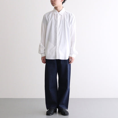 This is a wide straight silhouette model. It has a natural and beautiful silhouette with a relaxed straight line with room at the hips and thighs and a slight taper to the hem. The balance between the gentle volume around the waist and the slight taper is very good, and the silhouette will easily fit in with any coordination. The front has a zipper fly, and the back pockets have YAECA's pith name. The name "YAECA" appears on the tuck buttons and rivets.