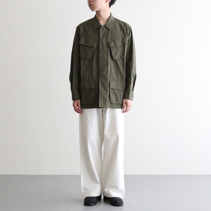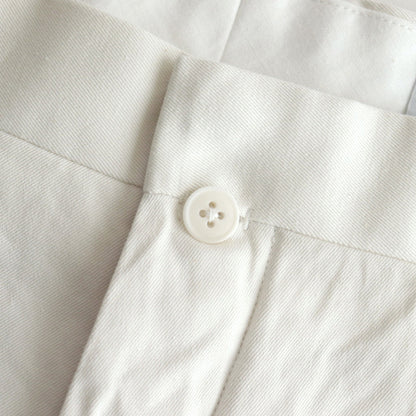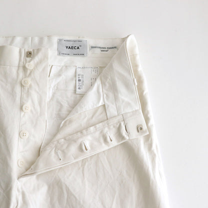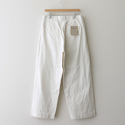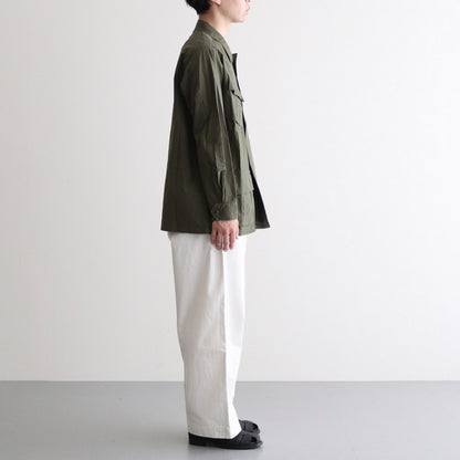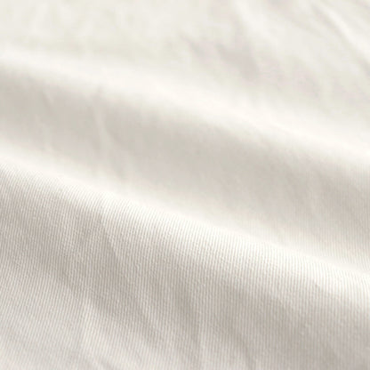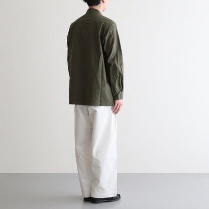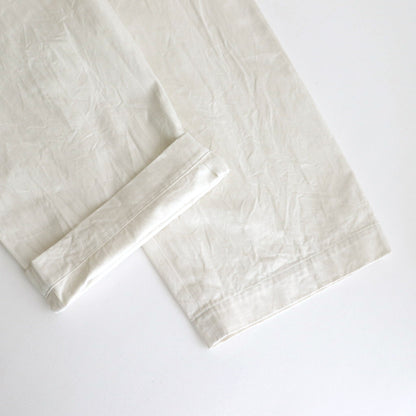 YAECA's original cotton chinocloth is used for all processes from yarn selection to weaving. Regular-ounce thickness for seasonless wear. This chinocloth has a moderate firmness and elasticity. The weaving method and the texture of the threads give this fabric a gentle and calm atmosphere. The fabric is washed and sun-dried after production to give it a natural wrinkled appearance.