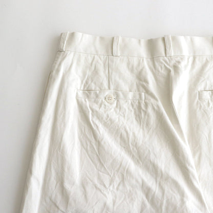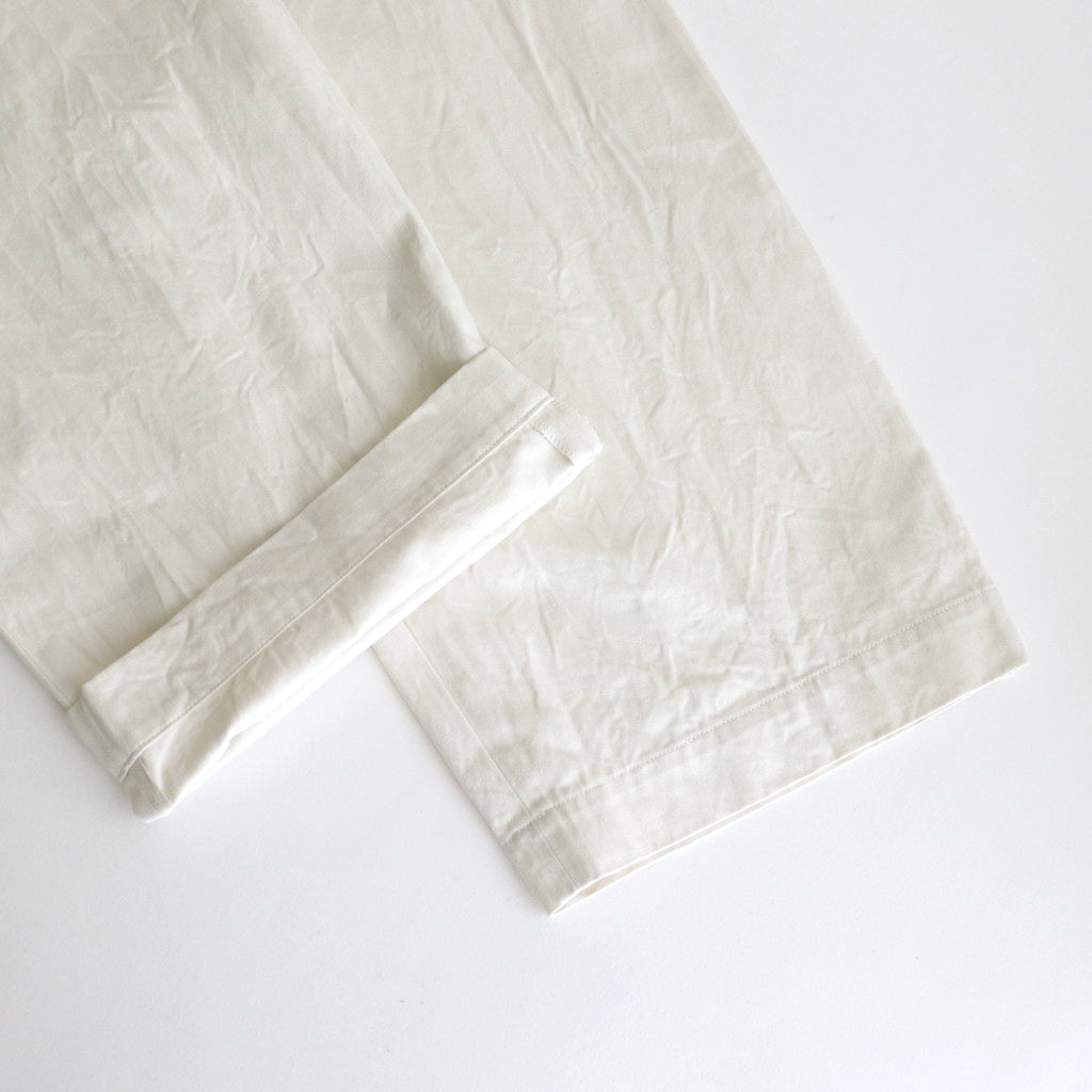 The wide, straight silhouette falls from the relaxed thighs to the hem. The silhouette is straight but slightly tapered toward the hem, creating a silhouette that is thick but not heavy. A gusset in the inseam provides a comfortable fit by widening the range of motion. The front has slit pockets along the side lines and a fob pocket called a "clock stash" is designed near the right pocket. The back has single ball-rimmed pockets with button closure. Zipper fly design.