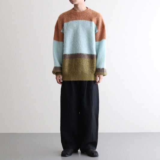 A knit material based on kid mohair using long-pile yarn called tam tam yarn. Mohair, which is the hair of Angora goats, has smaller scales (scales on the surface of the fiber) than wool, and has a smooth, soft texture and an elegant luster. In order to express the atmosphere of the work, the fabric is knitted and then brushed to blur the boundaries of the colors, and then a crepe finish is applied to recreate the texture of the piece. (Normally, a napping process is applied after the fibers are fulled.)