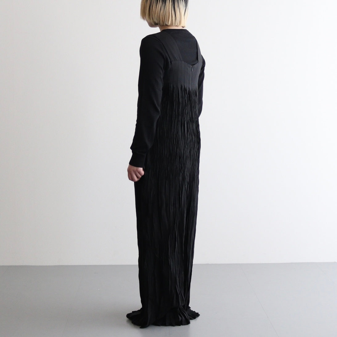 This full-length jumpsuit is characterized by the generous tucks at the chest. The tucks and wrinkling of the fabric give it a dress-like appearance when worn. The area around the shoulders and neck has been finely adjusted to create a chest opening that can be worn as a single piece.