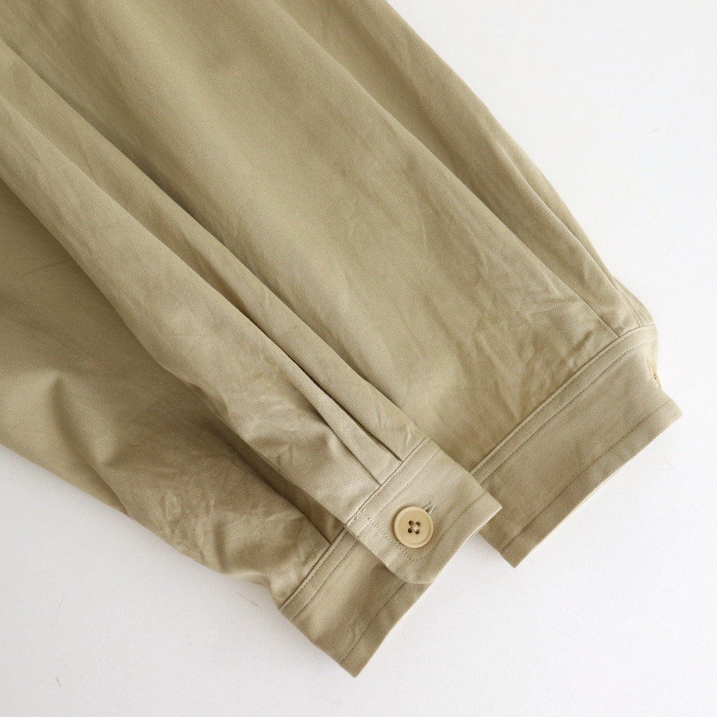 上質なコットン素材を使用した綾織生地を使用。適度に張りの出る中肉の厚みで織り上げ、製品洗いをかけることで奥行きのある風合いに仕上げています。裏地の設計はなくシーズンを跨いで着用できるほか、生地本来の風合いや落ち感を楽しめる仕様に。