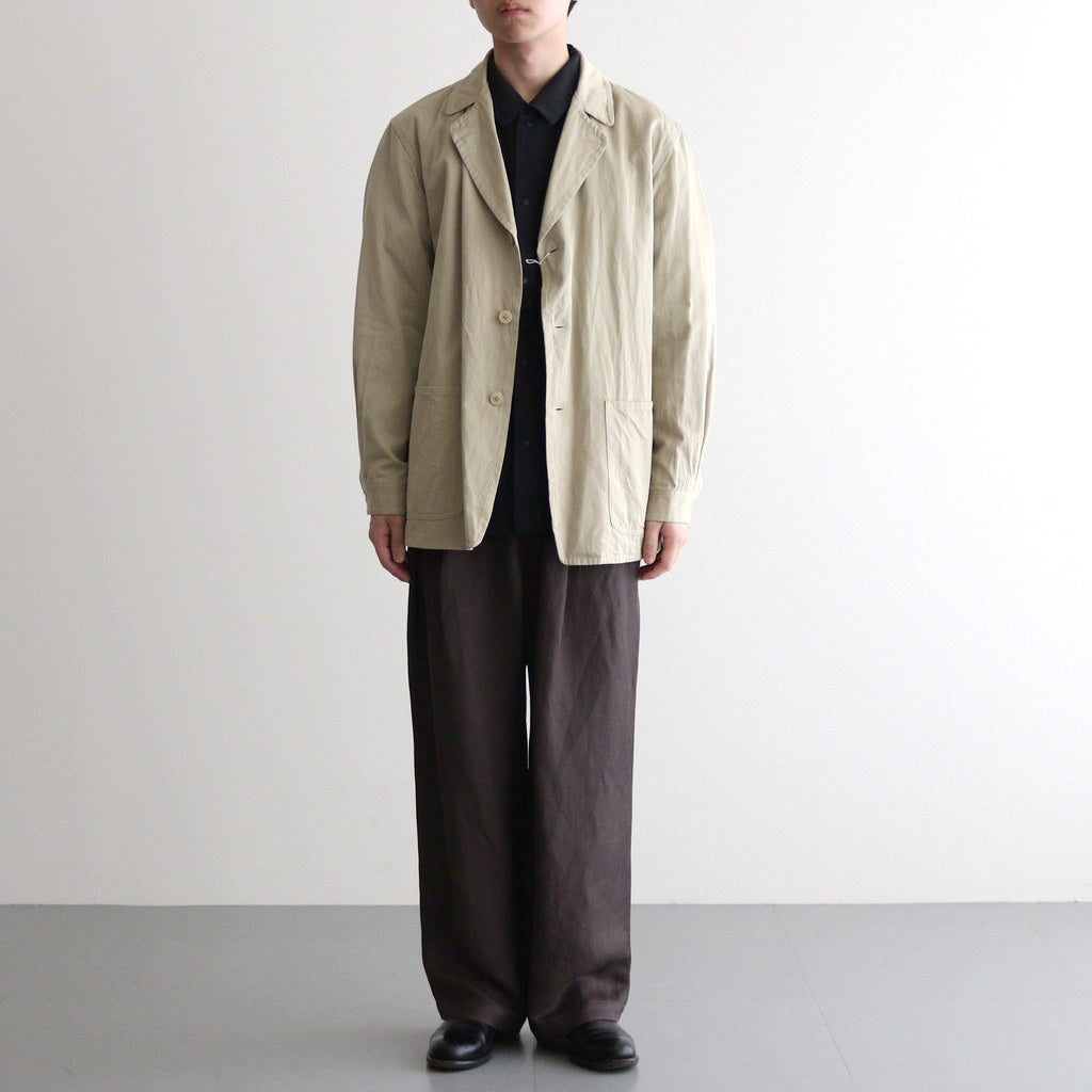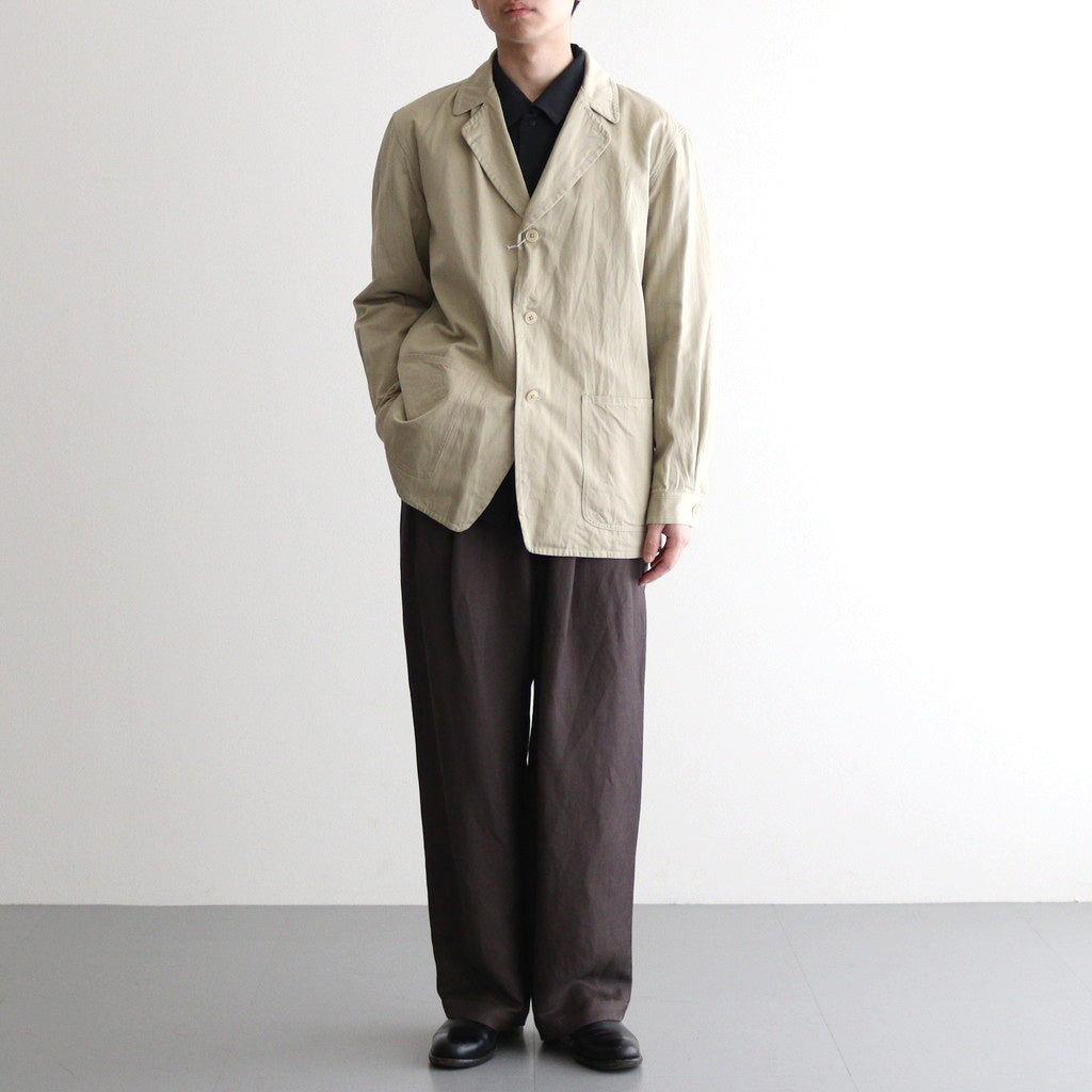 ほどよくゆとりを持たせたリラックスシルエットの3ボタンジャケット。控えめな大きさの襟は身頃と一体で製作されており、素朴な雰囲気に仕上げられています。身頃両サイドに共生地のパッチポケットを設計。シンプルな仕立てと生地の風合いがYAECAらしい気取らない雰囲気のジャケットです。