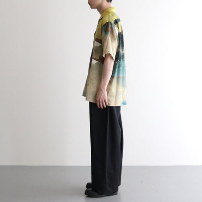 Short-sleeved open-collar shirt in a relaxed, laid-back silhouette. The distinctive long-pointed collar follows the feel of old clothes, while the deep slit under the armpit line, which can be opened and closed with a button, adds a modern element. It has a large chest pocket, slightly longer sleeve length to the elbow, and an overall relaxed silhouette.