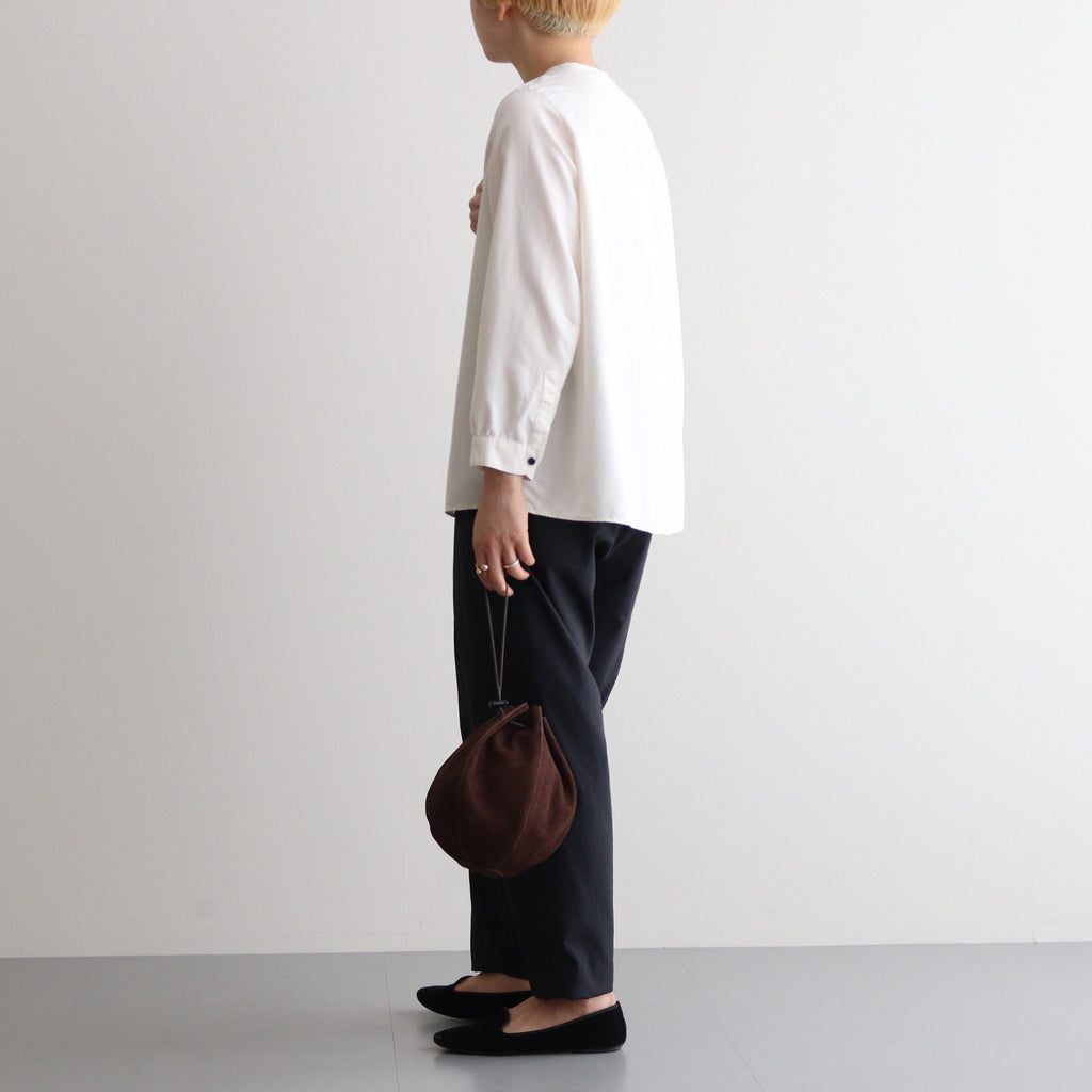 肩周りやアームはスッキリとさせ、身幅にゆとりを持たせたリラックスした印象で快適な着心地のシルエット。裾をほぼフラットの緩やかなラウンドにしてゆとりのある身幅とバランスをとった独自性のある形です。衿はノーカラーデザイン、袖口はシングルカフス仕様。袖先にギャザーを入れることでふんわりとした丸みを持たせると共に納まりを綺麗にしています。釦には高級感のあるボタンを採用、小さめのボタンがとても可愛いです。細かく整列した丁寧なステッチもこのシャツの良さです。ステッチはボディと同色にしてプレーンな印象になっています。