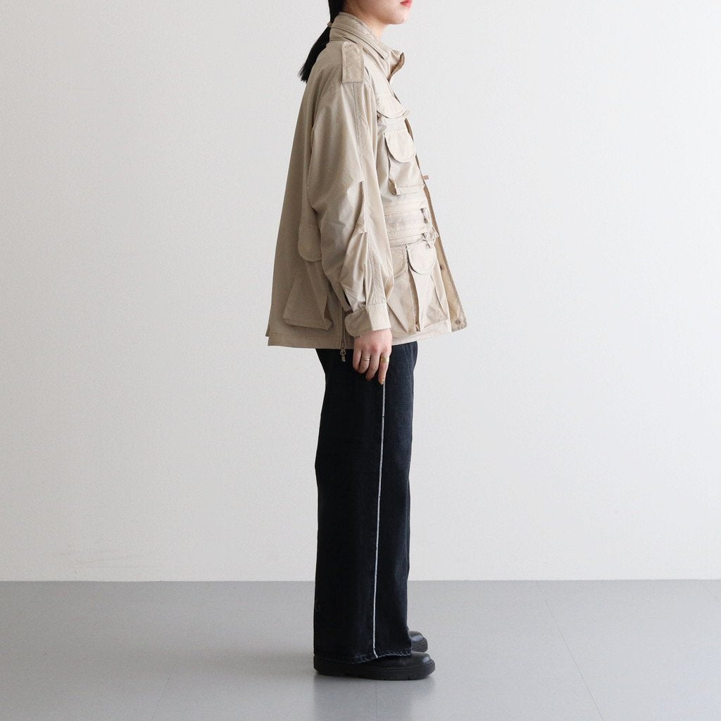DAIWA PIER39のシグネチャーとも言えるポケットワーク配したフィッシングジャケット。ルアーケース、タックルボックスを収納することはもちろんのこと、サングラス、ペン、パスポート、携帯電話なんでもござれの収納力を持っています。立ち襟内には簡易フードが収納されており、小雨が降ってきた際にも対応できます。サイドのジッパーはわきの下まで続いておりベンチレーションの役割も果たします。ミリタリーのディテールでもある前振りの袖がデザインアクセント、アクションプリーツを加え、袖口も調整出来るようにすることで 、釣りの際の可動域を広げ、袖口のもたつきも解消した、まさに完璧なフィッシングジャケット。肩幅、身幅、アームホールなど全体的にゆったりしたサイジング・シルエットです。