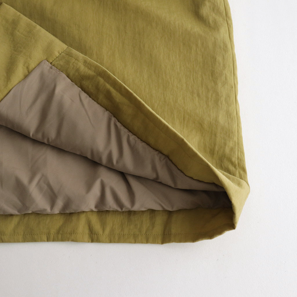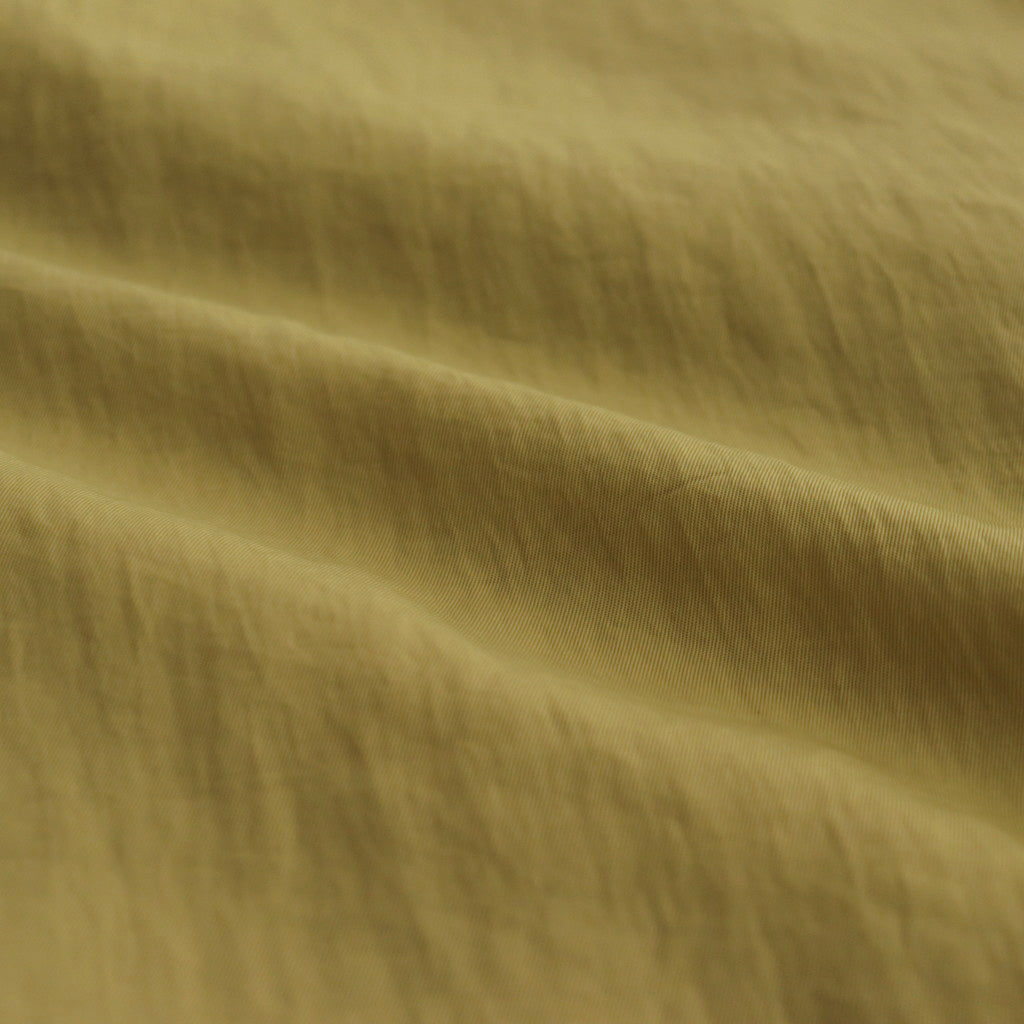 ウォッシュ加工によってムラとシワ感を出した風合い豊かなナイロン素材を使用。撥水加工がかけられているため雨や汚れにも強い仕様となっています。中綿に適度な保温性と軽量感を持ち合わせたポリエステル素材を封入。裏地には滑りの良い平滑な質感のポリエステル生地を張っています。