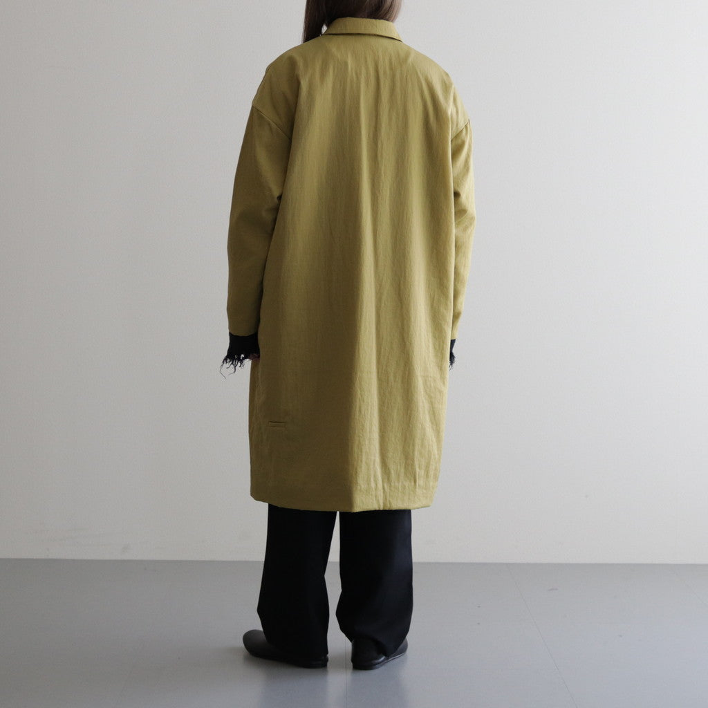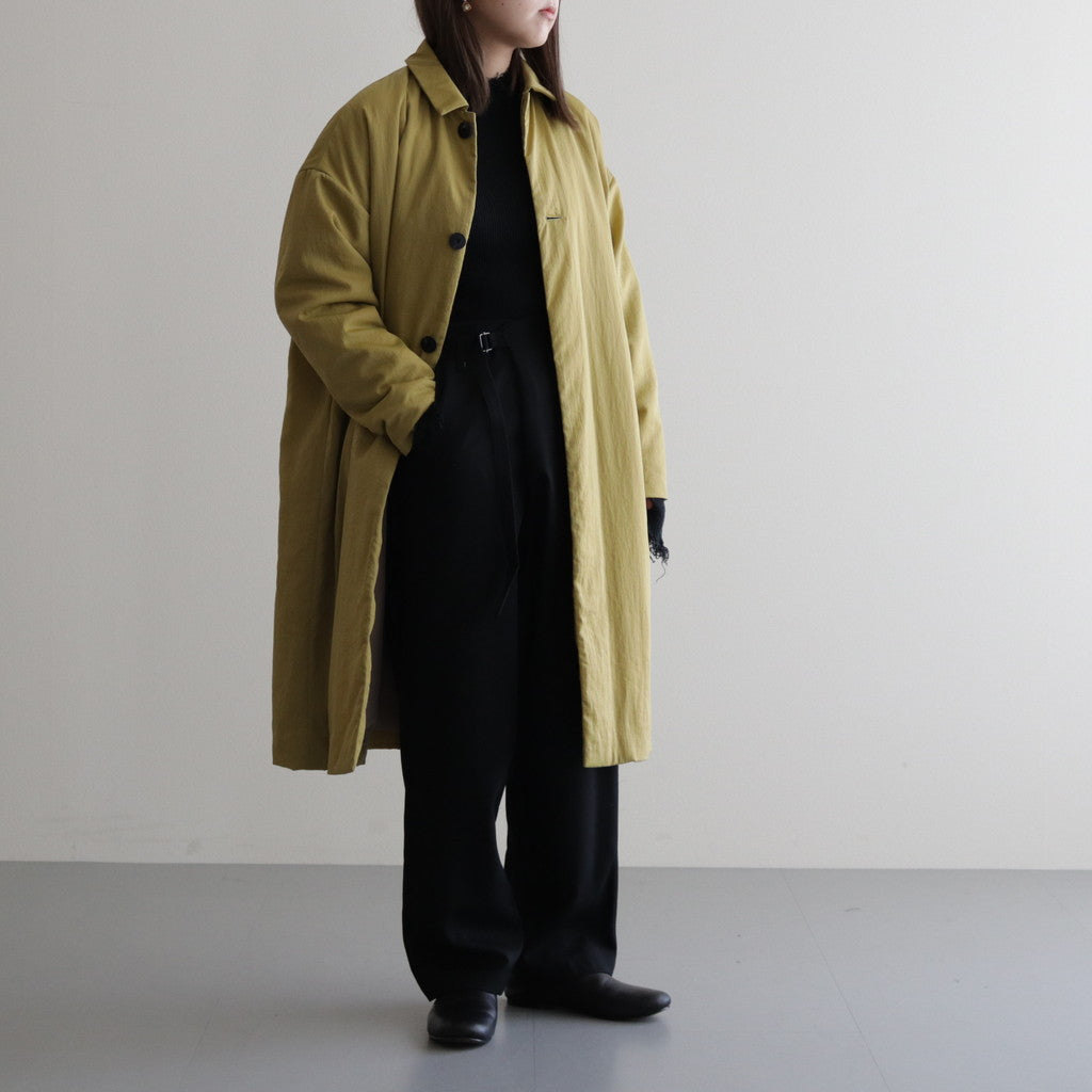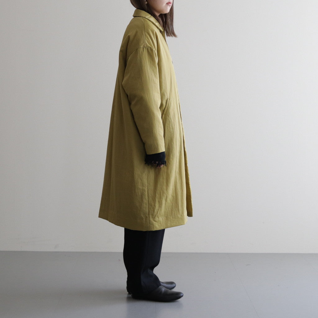 身幅をワイドにとったDulcamaraらしいシルエットの中綿入りコート。フロントは一つだけボタンを見せた変則的な比翼仕立てのボタン式。裾に向けてゆるやかに膨らみを持たせたAラインシルエットで製作されており、中綿による全体の丸みと相まってゆるい雰囲気に。身頃の両側にハンドウォームポケットを設計。ざっくり一枚羽織るだけでしっかりとした保温性も確保できる非常に便利な一着です。