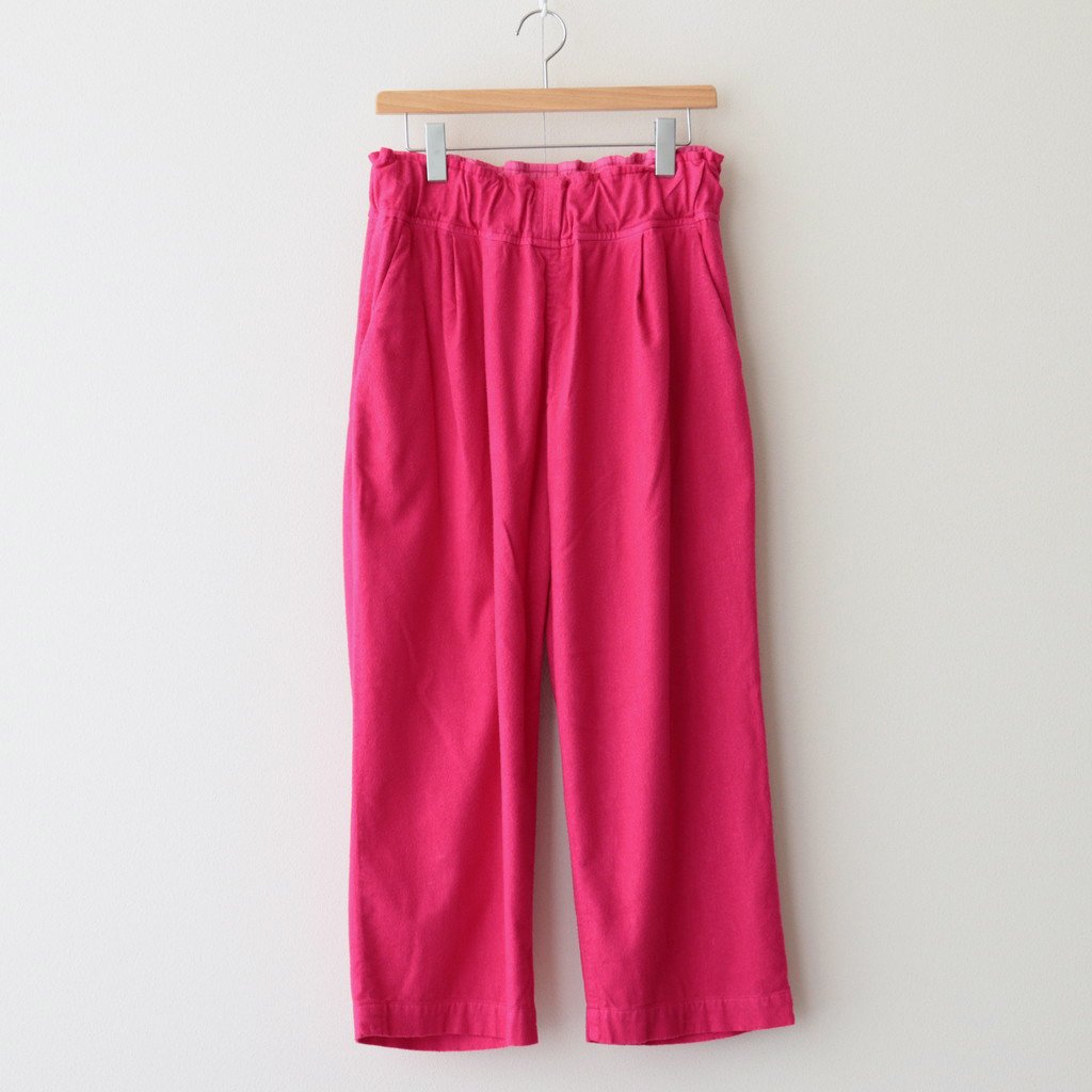 「フランネル レーヨン・ガーメントダイ」テキスタイルを使った8分丈イージーパンツ。経糸に綿、緯糸にレーヨン双糸を使った平織り生地を深く起毛しています。レーヨンは非常に暖かいのが特徴でこの生地もとても暖かく、加えて起毛することで滑らかに柔らかくなった風合いが特徴です。レーヨンの量が多い生地ですので製品染めを施すことで生地のコシがなくなり、独特の重みと落ち感をもった心地よい生地に仕上がっています。タンブラー乾燥を施す事で程良く力の抜けたカジュアルな雰囲気がありながら、どこか落ち着いた大人な印象を与えてくれます。ウエストはゴムとドローコードで微調整が可能なイージーパンツデザイン。腰の位置にハンドポケット付き、バックはフラップポケットを配置しています。股上をたっぷりと深めにとることで腰周りにゆとりを持たせ、裾に掛けて緩やかに絞りを入れたリラックスした印象のシルエットです。フロントにアウトタックを入れ、独自のパターンニングにすることで丸みのある綺麗なシルエットを表現しています。