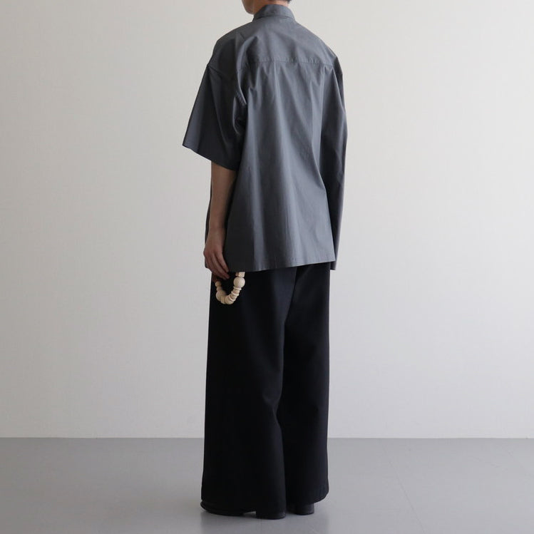 身幅や肩幅にゆとりを持たせ、肩を落としてゆったりと着るオーバーサイズのボックスシルエットシャツ。前立ての釦にはシェルボタンを使用。左右の胸にパッチポケット、見た目に干渉しない脇線に沿ったハンドポケットを配置。左胸ポケットにGraphpaperのピスネーム付き。