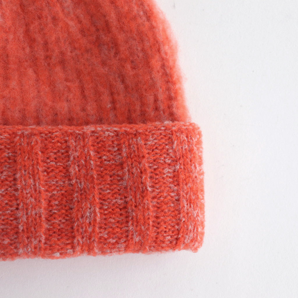 エクストラファインウールとナイロンの糸を編み立て、起毛加工したニット帽。