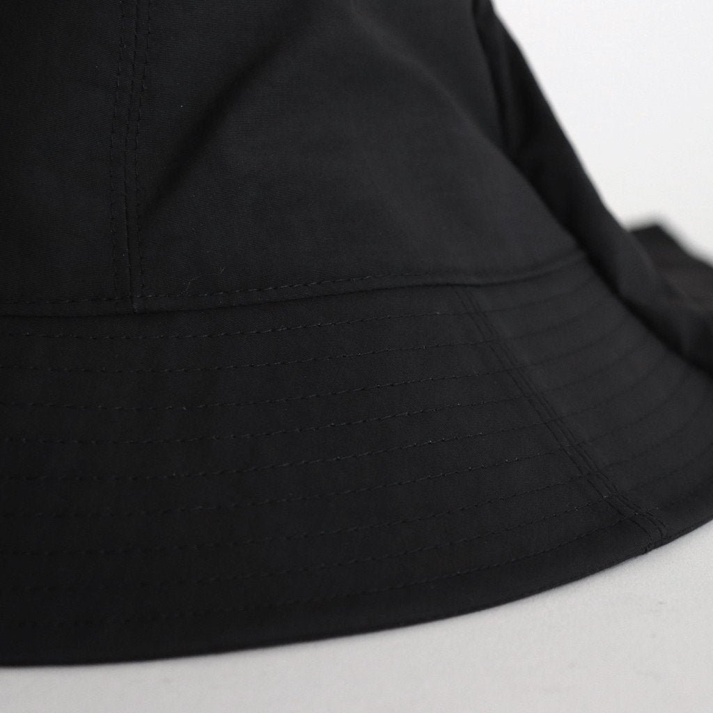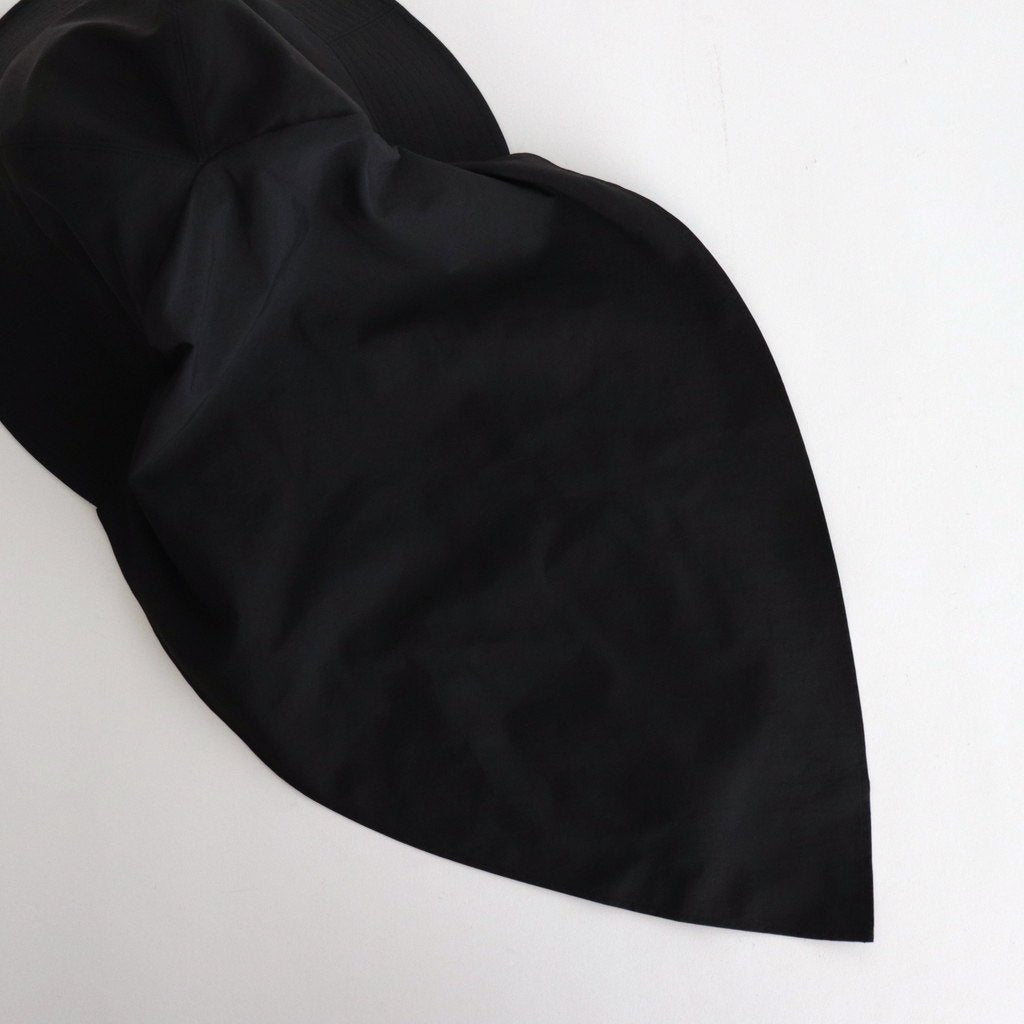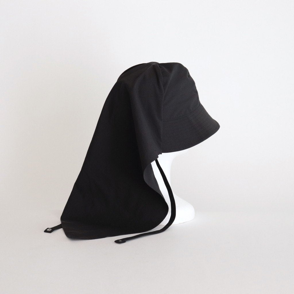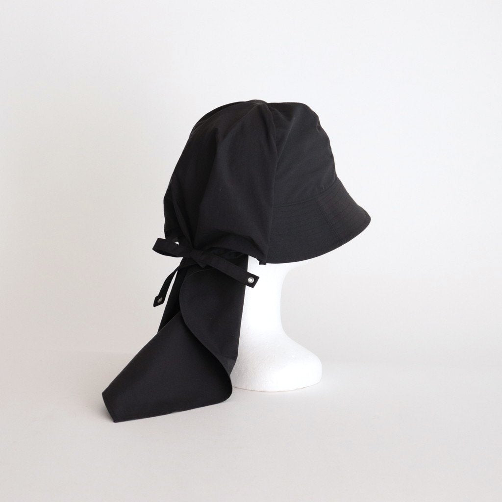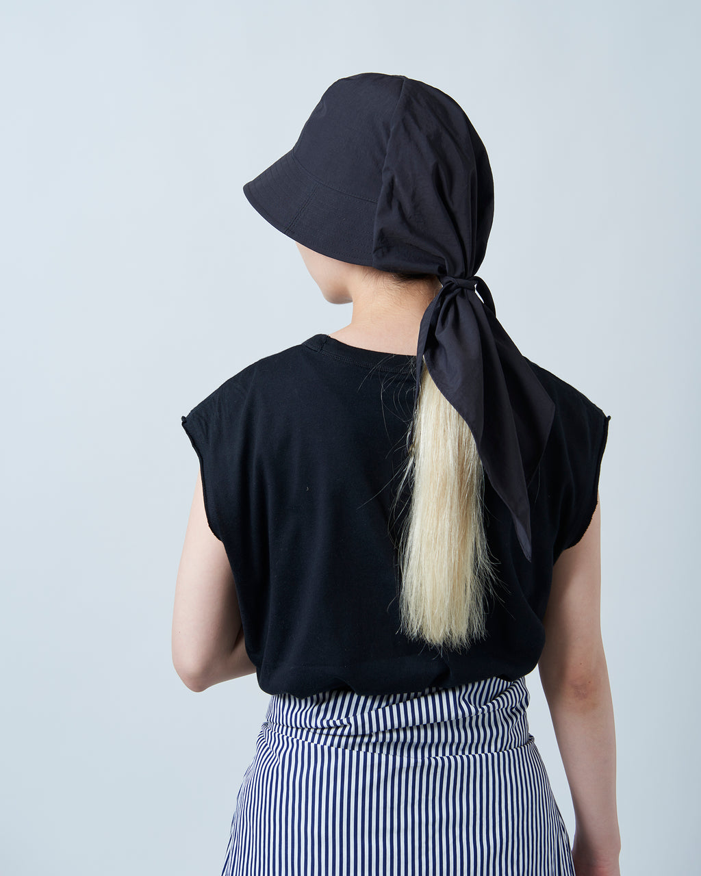 日本の伝統的なスタイルをシンプルなメトロハット型に落とし込んだデザインです。特徴的な後ろのスカーフはお好みでアレンジが可能。特徴的な後ろ姿と前から見たときのシンプルなシルエットでギャップを楽しんでいただける作りです。生地をそのまま垂らしておけば日よけ効果も高く、後頭部はゴムが配されておりフリーサイズとなっているため、どなたでもフィッティング可能な仕様となっています。