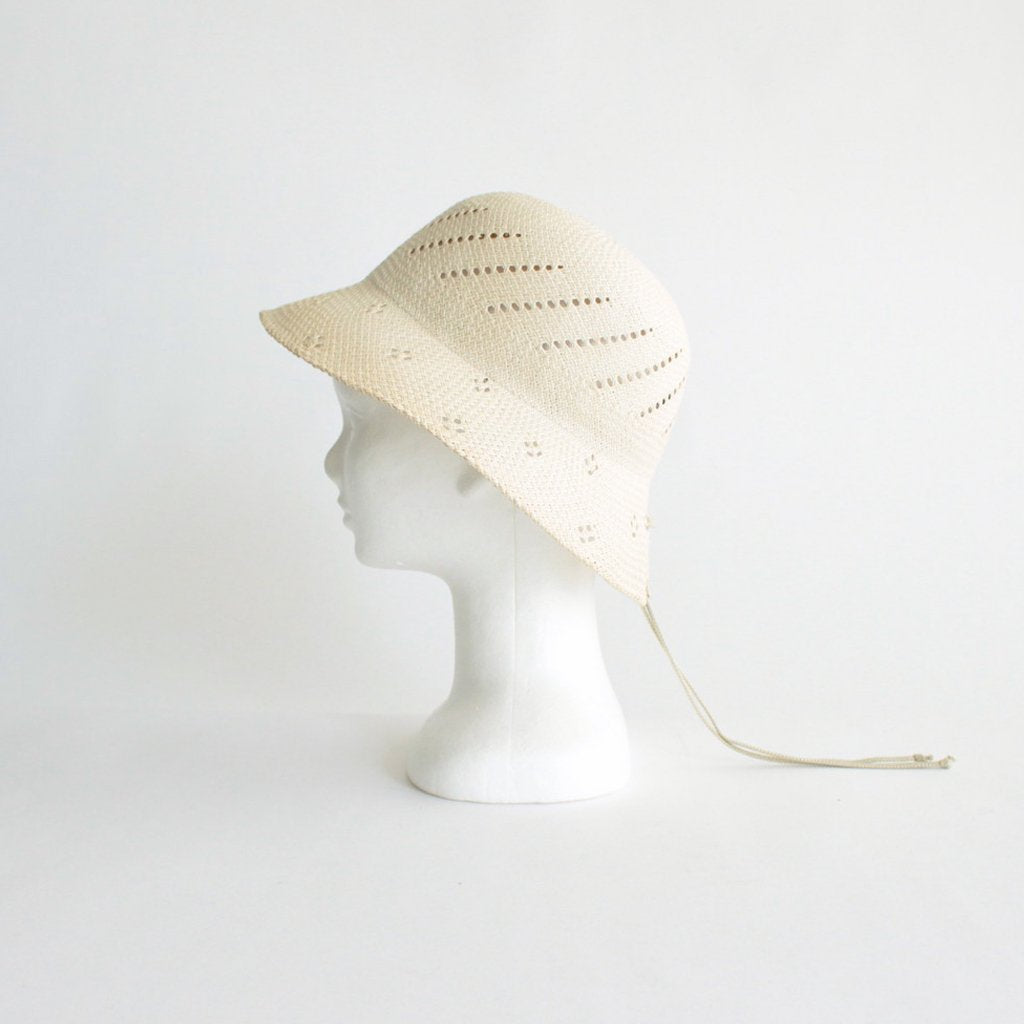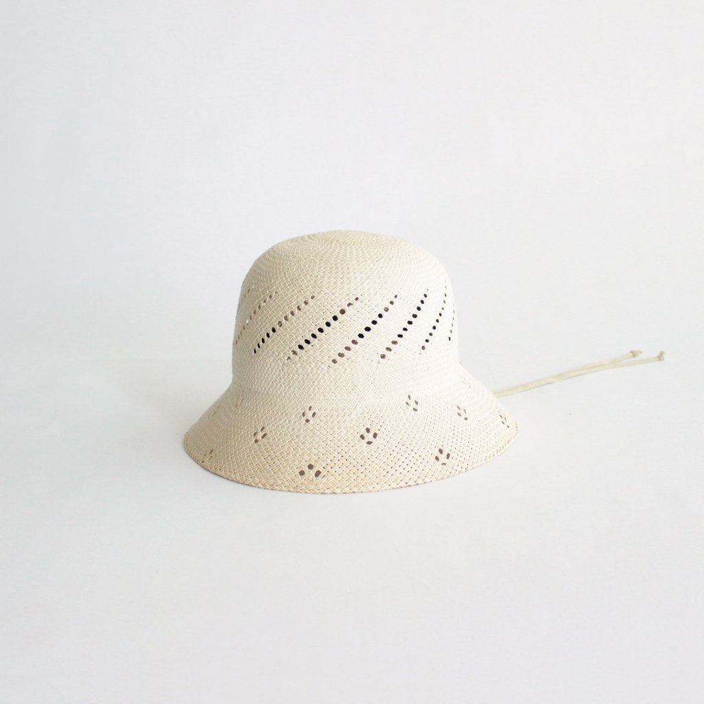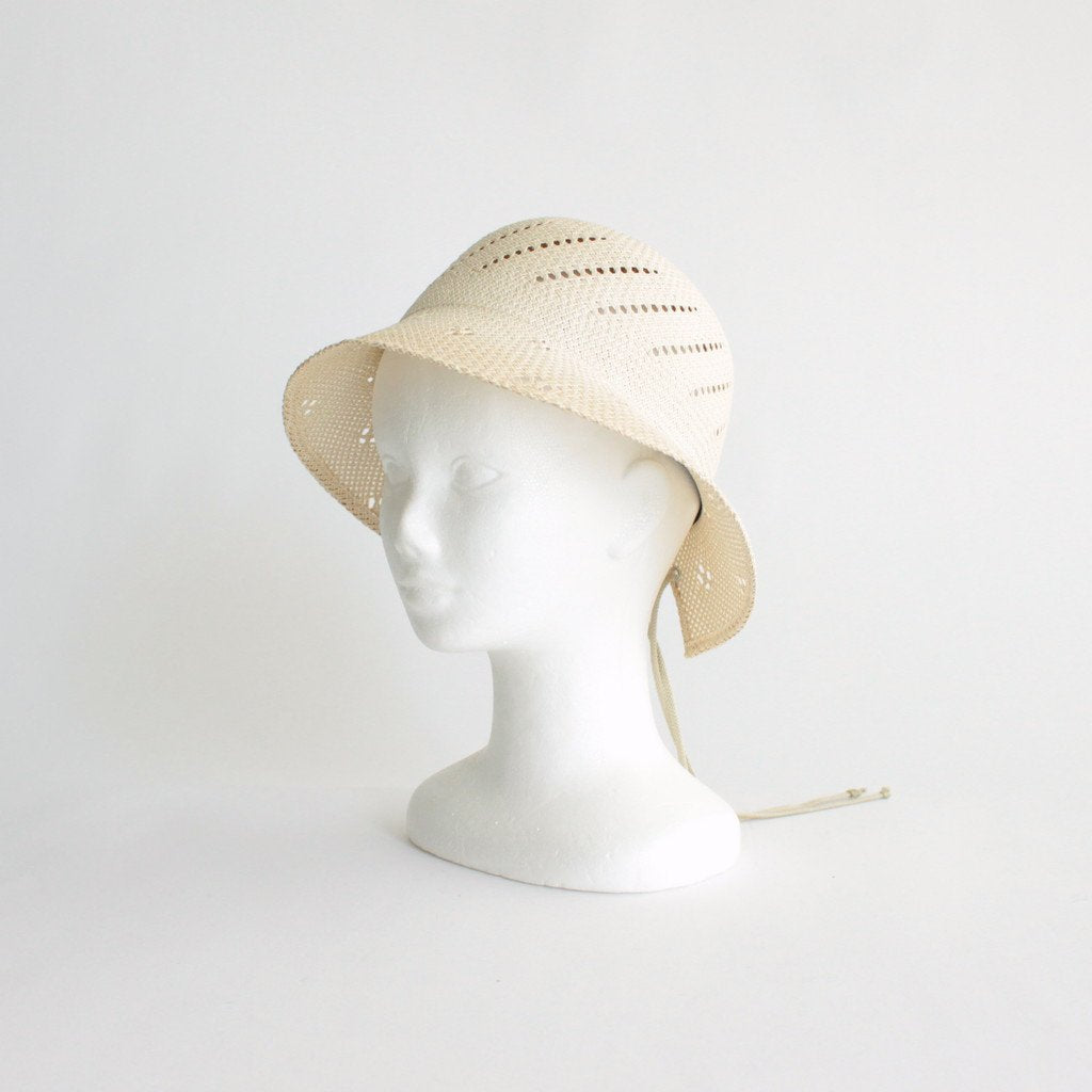 削ぎ落とされたメトロハット型のシルエットで製作。バックには束ねた髪を逃がすことのできるスリットが入っており飾り紐が配されています。すっぽりと目深に被っても目線を遮りにくいデッドストックならではの透かし模様が特徴的。透かし模様から木漏れ日のようにできる影が雰囲気の良い一品です。