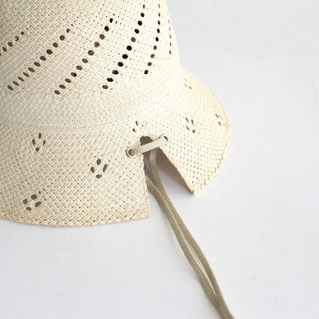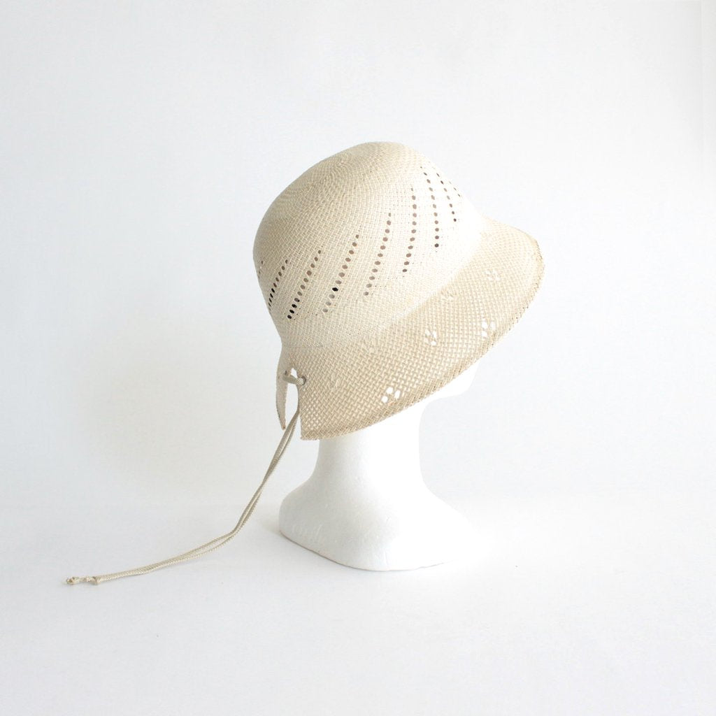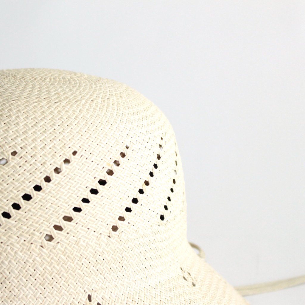 削ぎ落とされたメトロハット型のシルエットで製作。バックには束ねた髪を逃がすことのできるスリットが入っており飾り紐が配されています。すっぽりと目深に被っても目線を遮りにくいデッドストックならではの透かし模様が特徴的。透かし模様から木漏れ日のようにできる影が雰囲気の良い一品です。