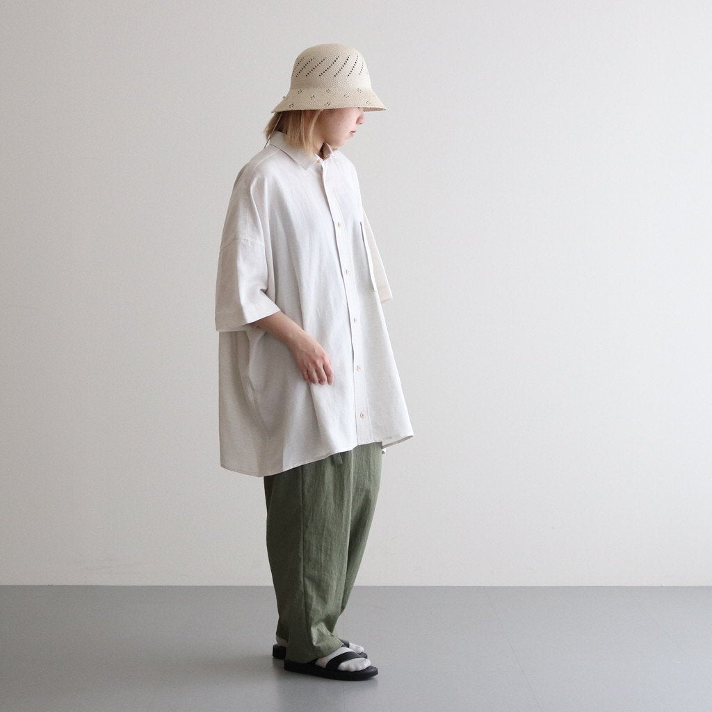 現在では作られなくなってしまった珍しいデッドストックのペーパー生地を使用。セル加工されたペーパーパナマ素材を3本引き揃えた生地となっており、3本のうちのセンターだけ配色の切り替えが施されています。シャープな形を出すためノリをしっかりと入れ、手触りはやや固めの仕上がりに。