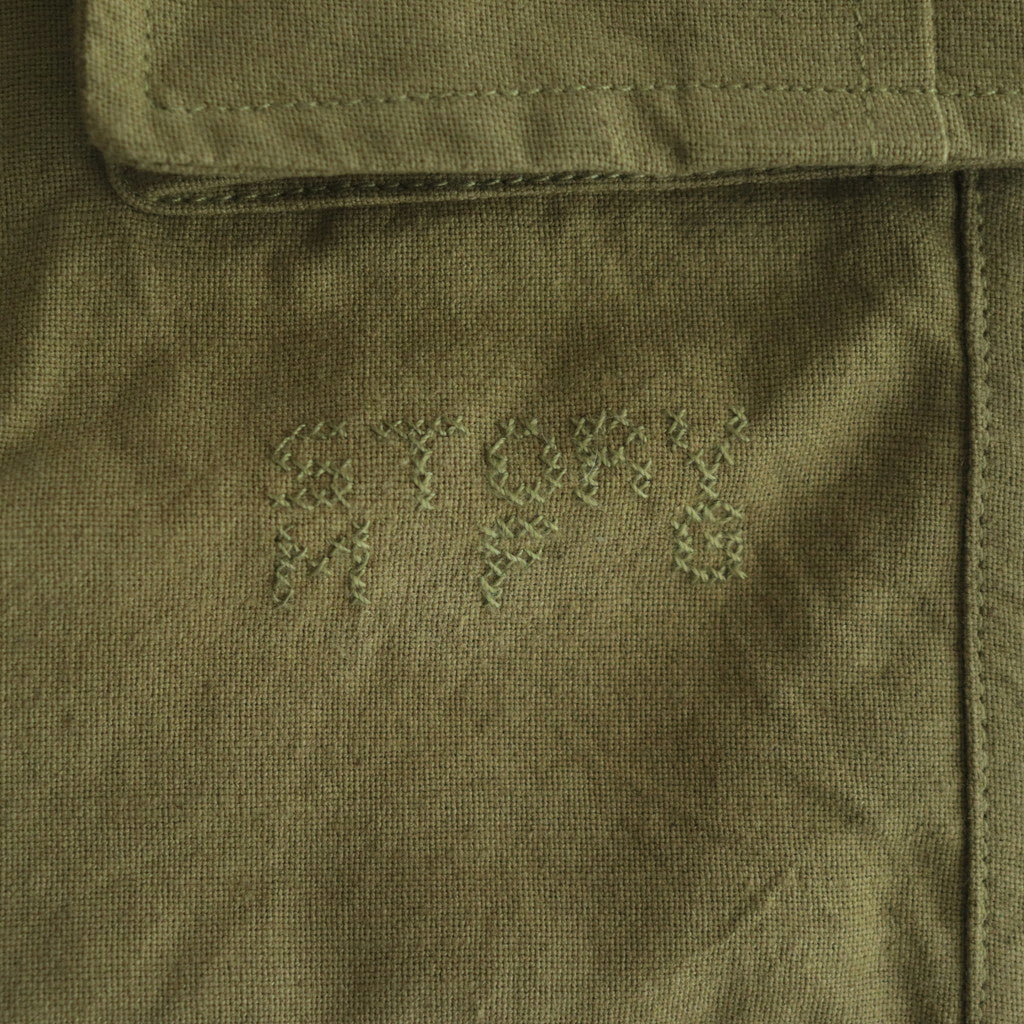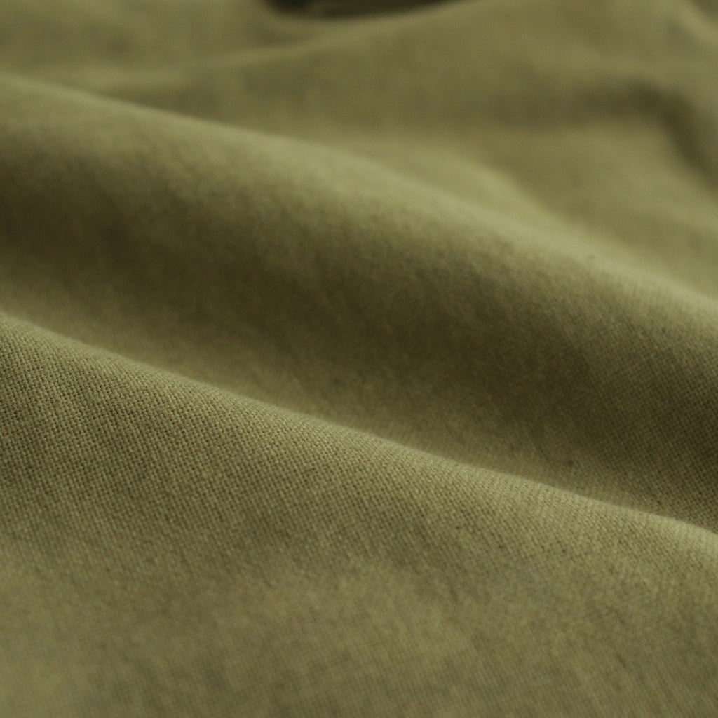 オーガニックコットン製のスラブ糸(不規則な節がある糸)をゆっくりと織り上げ、リネンのようなドライな肌触りと空気を多く含んだ柔らかい着心地を両立。深みのあるオリーブカラーはミロバランという植物の染料を鉄と化学反応させて表現。環境負荷の少ない特殊な染色方法です。