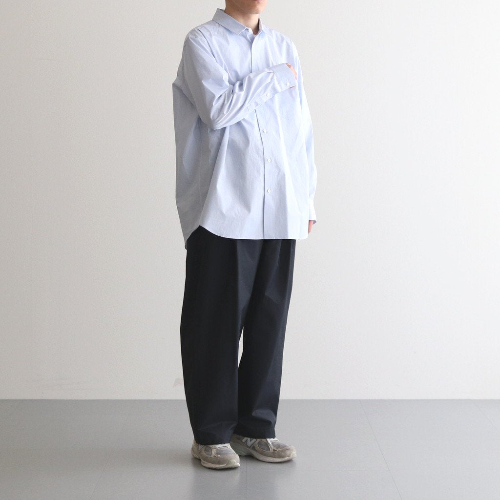 適度なイージー感を持たせたカジュアルな仕様ながら、steinらしいどこか無機質で冷たい印象の残るトラウザーに仕上げられています。ウエストは内側ぐるりにドローコードを通し背面にはゴムを設定。ドローコードで調整可能なイージー仕様ながら、ベルトを通して着用いただけるようベルトループも設計されています。ワイドなパンツながらフロント部分のツータックでシルエットに無理が出ないようバランスを調整することによってただワイドなだけでない収まりの良いパターンワークで仕立てられています。