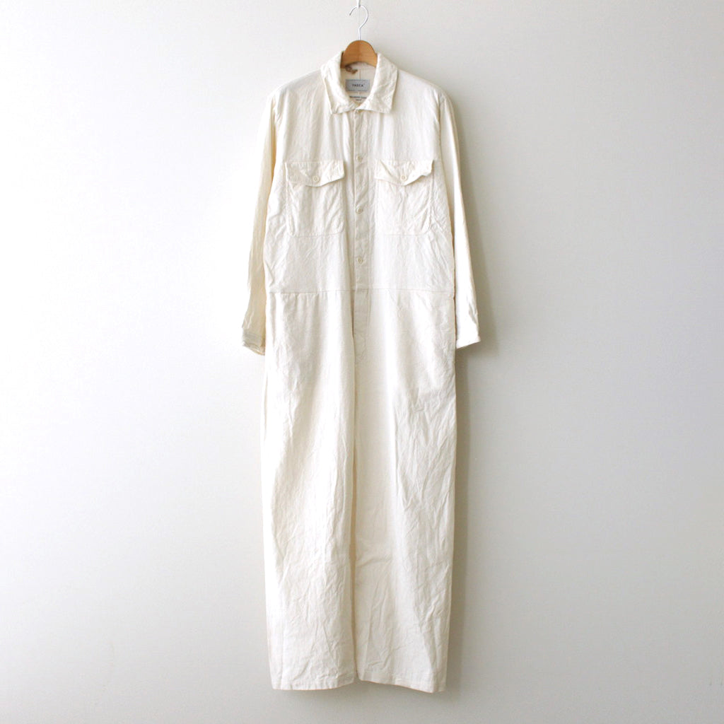 ゆったりとしたシルエットで製作されたワークテイストのオールインワン。心地よい生地感とゆとりのあるシルエットでヤエカらしいニュートラルな雰囲気が漂う一着。小物との組み合わせ次第でいろいろなコーディネートに見せることのできるシンプルなオールインワンです。