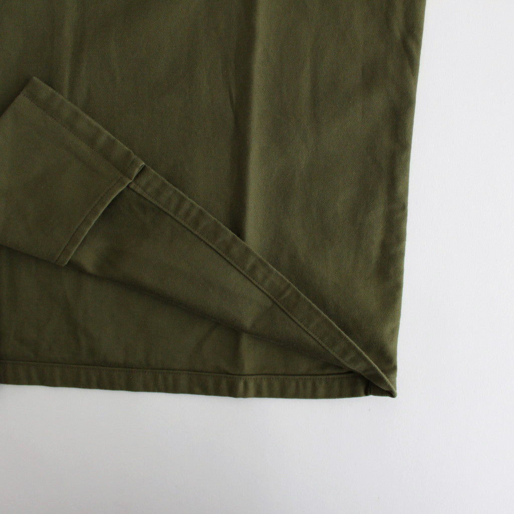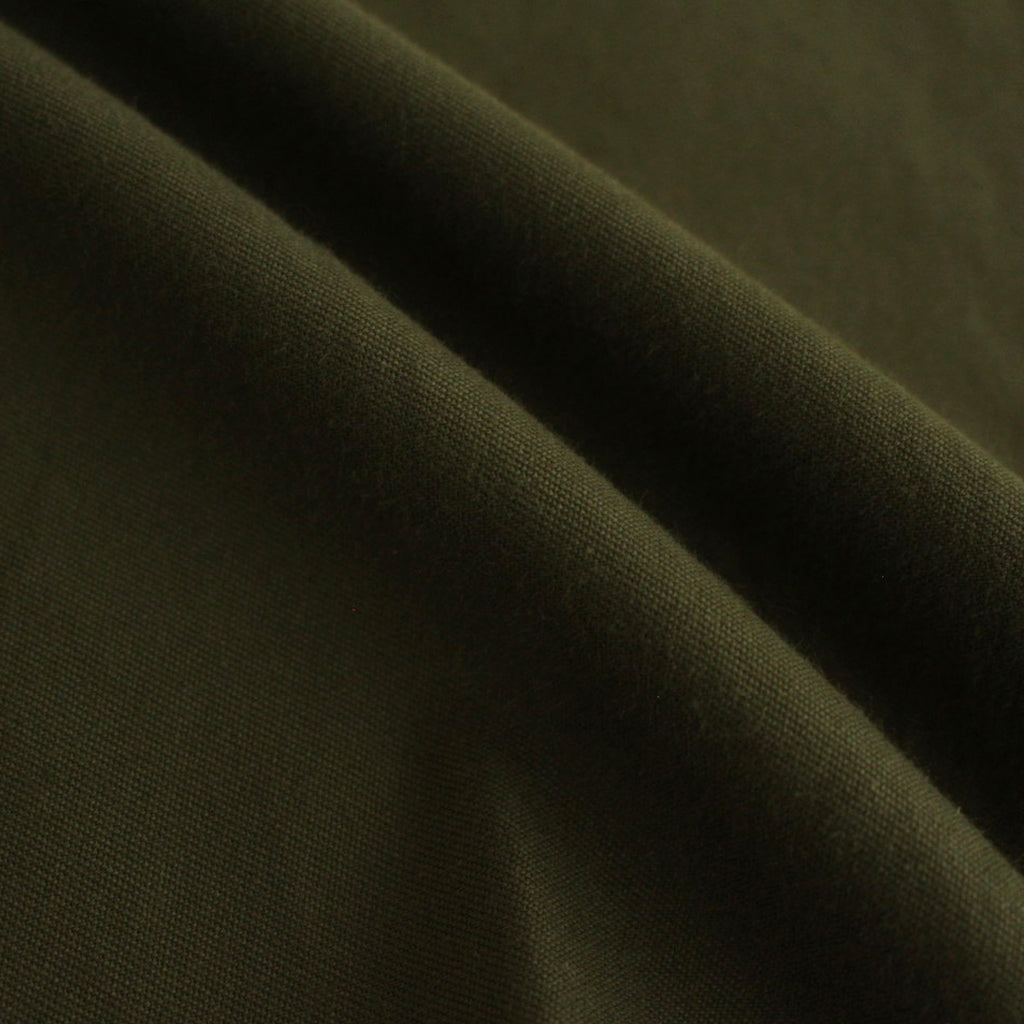 生地にはしなやかで高品質なコットンを使用。サテン組織で高密度に織り上げた生地を裏使いで使用することで武骨な凹凸感のある表面感となっています。深みのある色合いでしっかりとした厚みがあり、コシがありながらも程良く力の抜けた質感に仕上げられています。