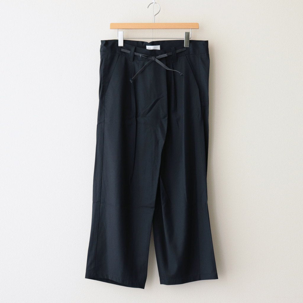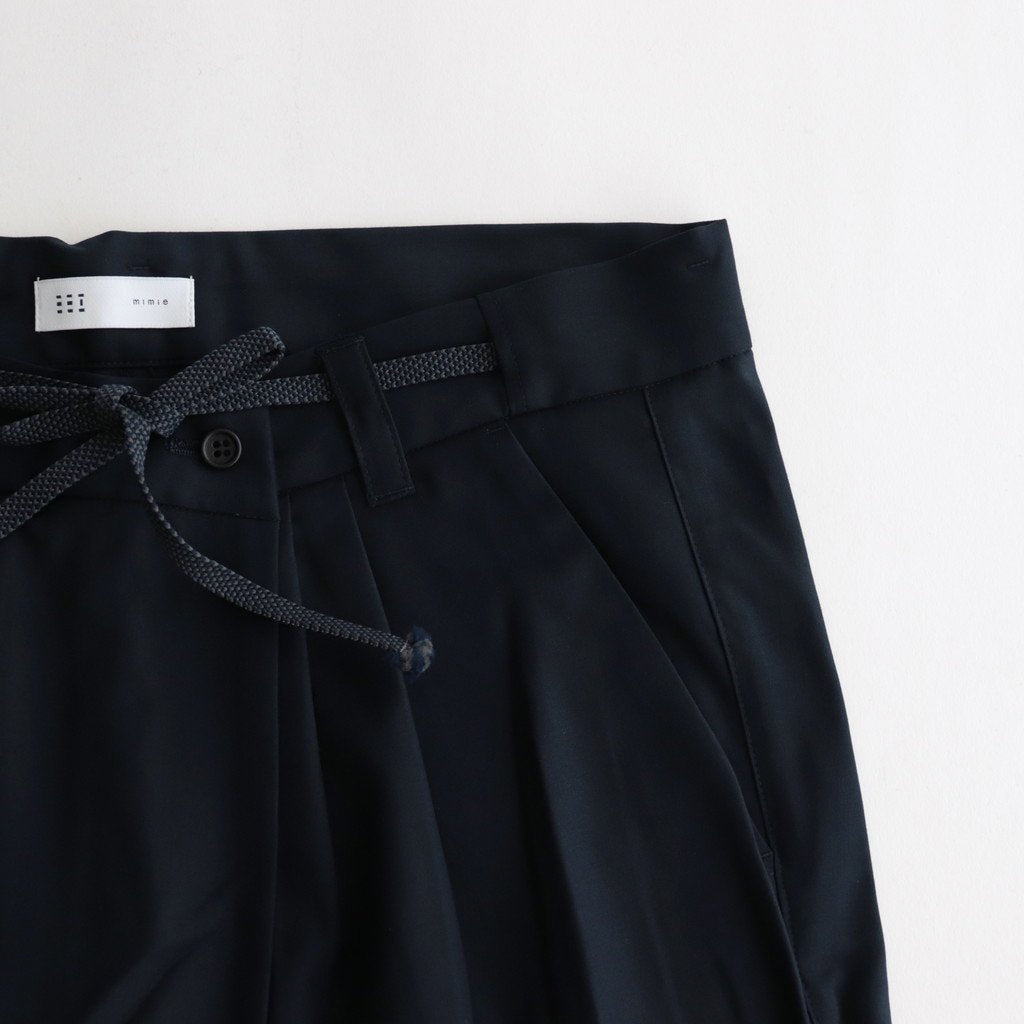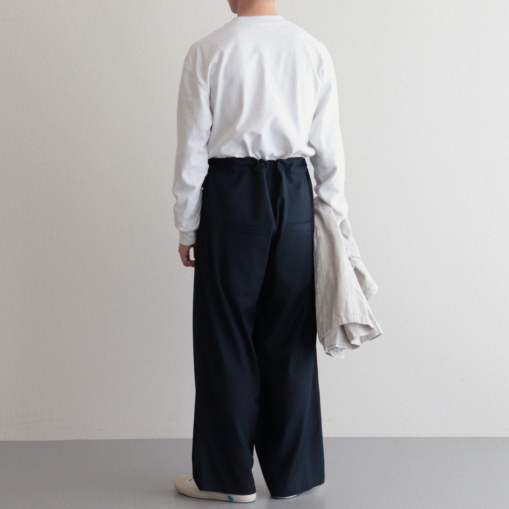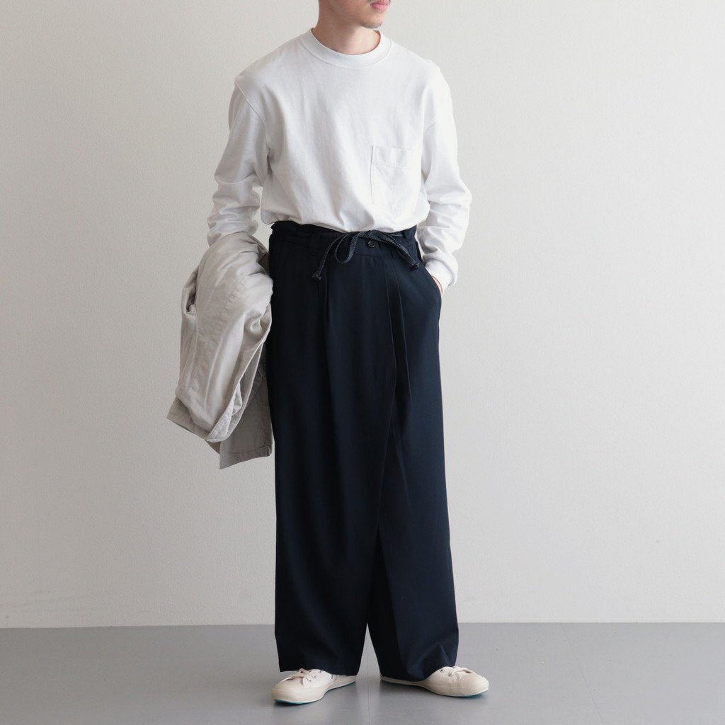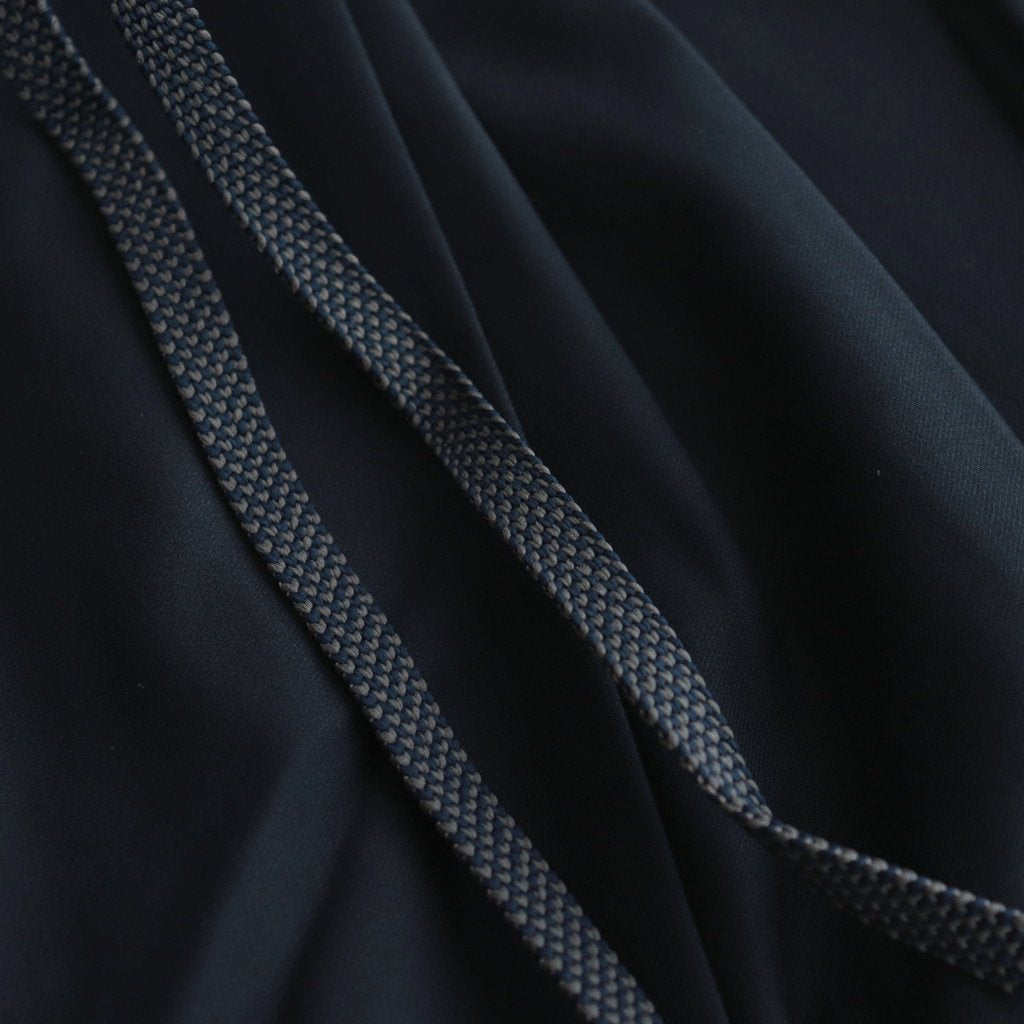 ゆったりとしたワイドストレートシルエットのイージー。股上には深くゆとりを持たせ、裾にかけてはストレートにストンと落ちる太めのデザインです。ウエストのフロント部分を重ねたデザインとすることで美しい生地の撓みが楽しめる1着に。またウエストは2タックデザインにする事で生地のドレープが優雅にゆったりとした表情をみせています。生地をタップリと贅沢に使うことで立体的かつ奥行きのある仕上がりに。ウエスト部分は紐でサイズ調節が出来るイージーパンツ仕様です。ドローコードに三重県の伝統工芸品である「伊賀組紐」を使用しています。