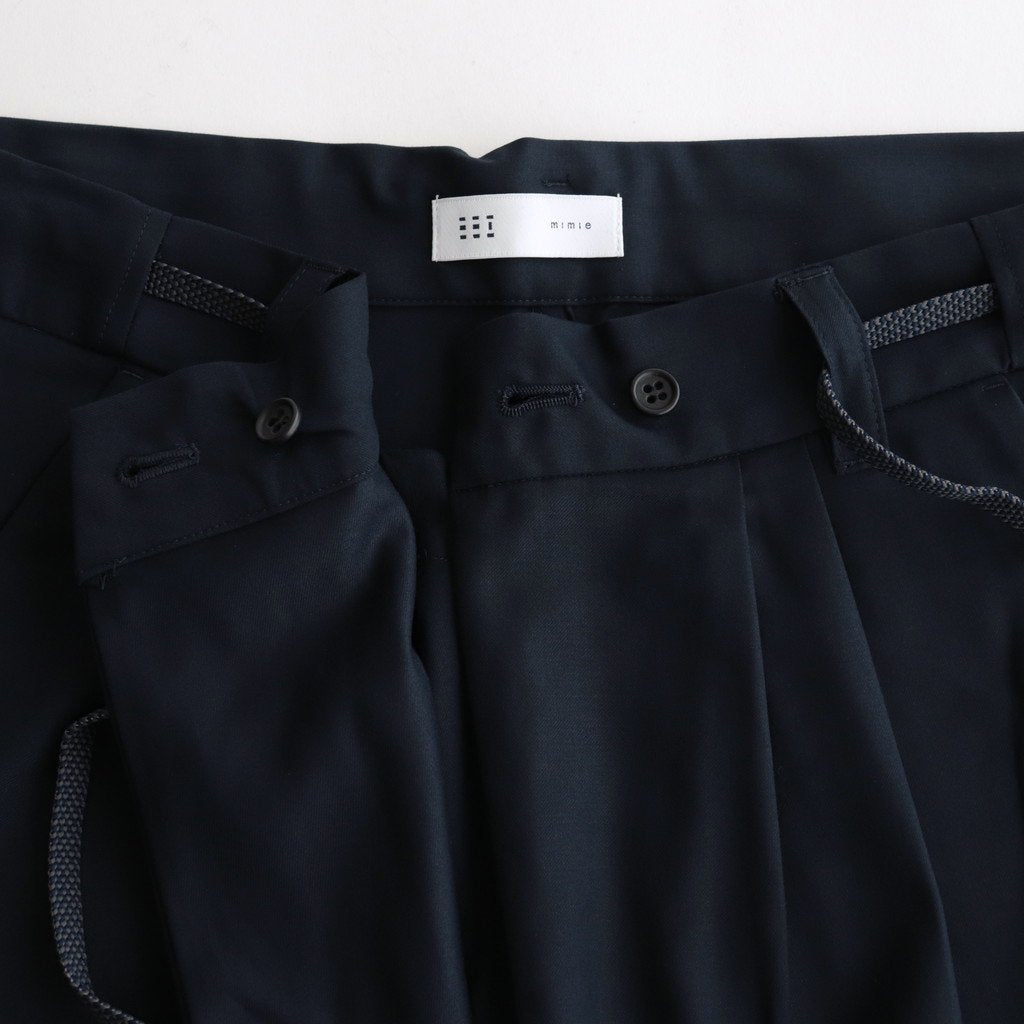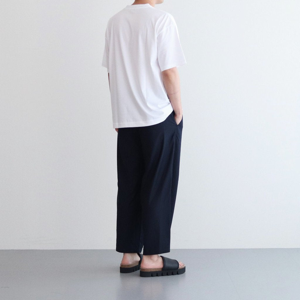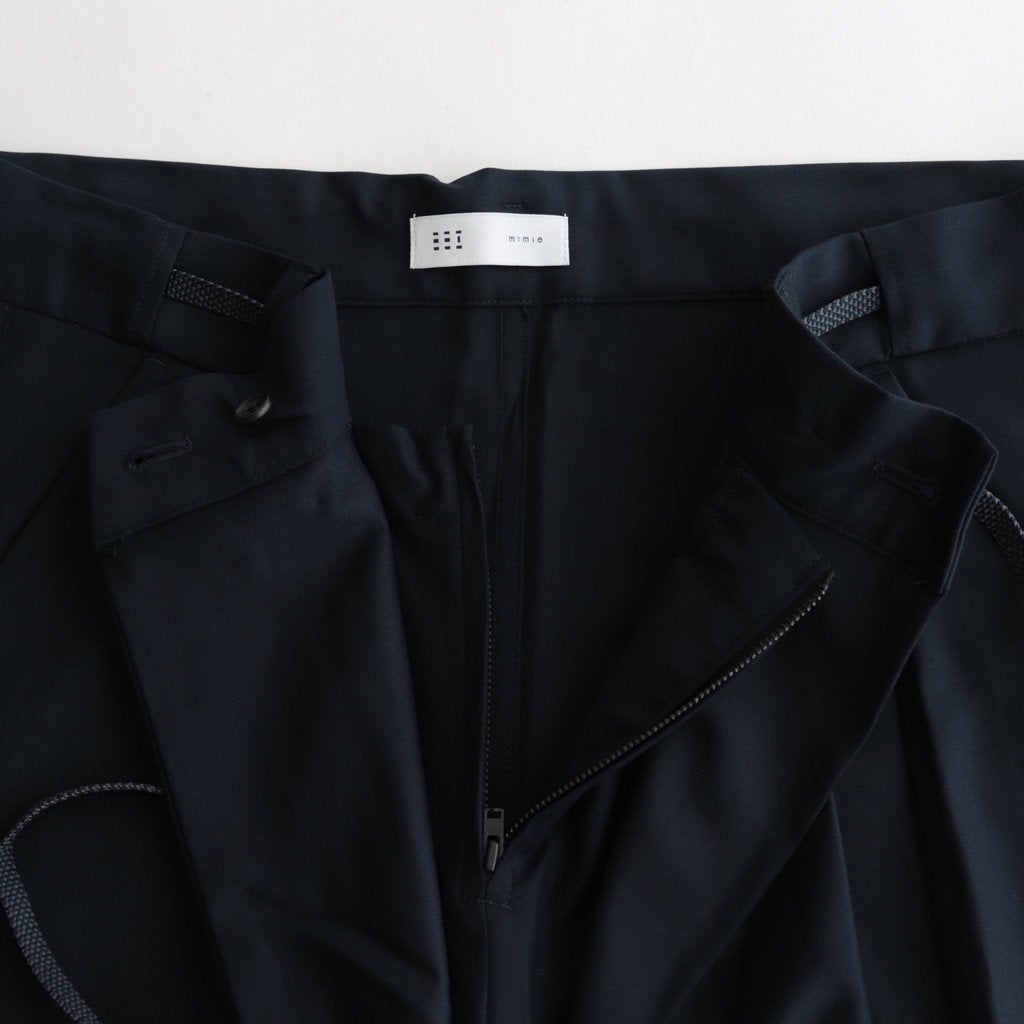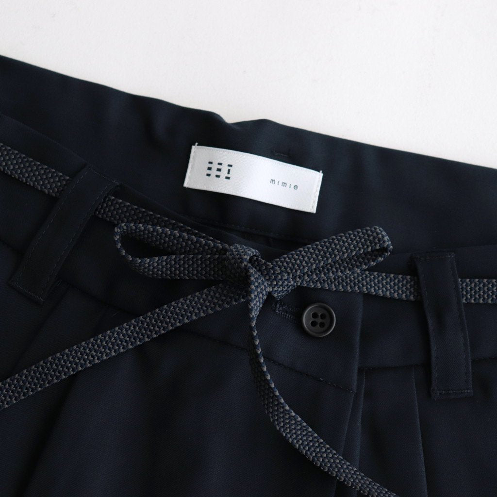 ゆったりとしたワイドストレートシルエットのイージー。股上には深くゆとりを持たせ、裾にかけてはストレートにストンと落ちる太めのデザインです。ウエストのフロント部分を重ねたデザインとすることで美しい生地の撓みが楽しめる1着に。またウエストは2タックデザインにする事で生地のドレープが優雅にゆったりとした表情をみせています。生地をタップリと贅沢に使うことで立体的かつ奥行きのある仕上がりに。ウエスト部分は紐でサイズ調節が出来るイージーパンツ仕様です。ドローコードに三重県の伝統工芸品である「伊賀組紐」を使用しています。