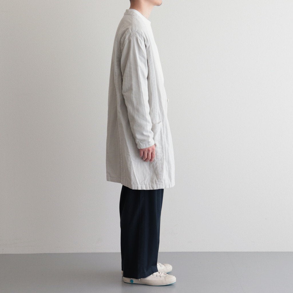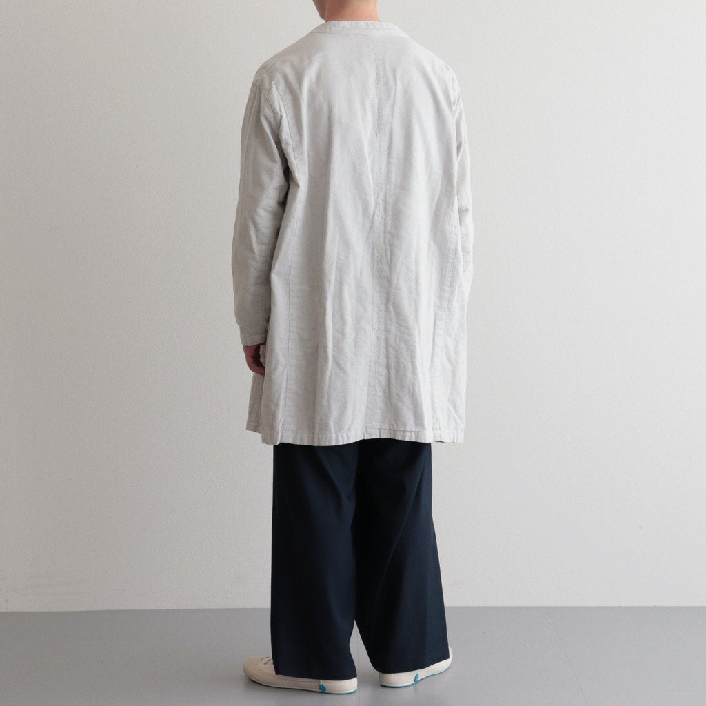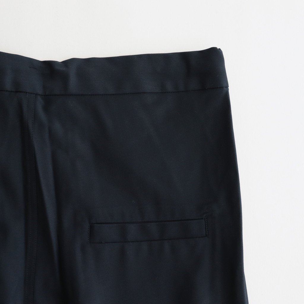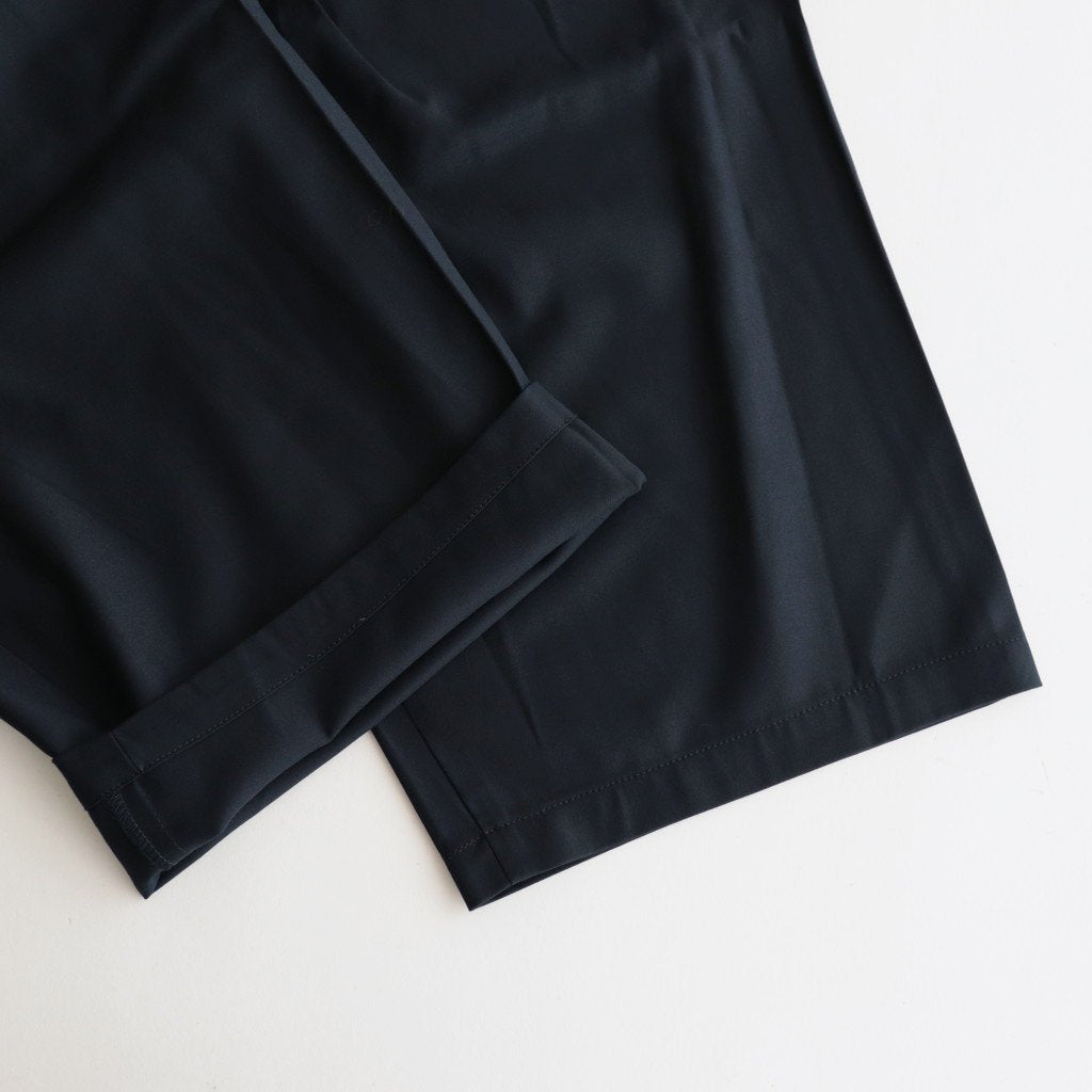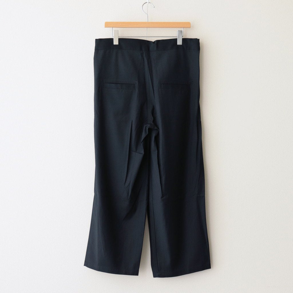 ゆったりとしたワイドストレートシルエットのイージー。股上には深くゆとりを持たせ、裾にかけてはストレートにストンと落ちる太めのデザインです。ウエストのフロント部分を重ねたデザインとすることで美しい生地の撓みが楽しめる1着に。またウエストは2タックデザインにする事で生地のドレープが優雅にゆったりとした表情をみせています。生地をタップリと贅沢に使うことで立体的かつ奥行きのある仕上がりに。ウエスト部分は紐でサイズ調節が出来るイージーパンツ仕様です。ドローコードに三重県の伝統工芸品である「伊賀組紐」を使用しています。