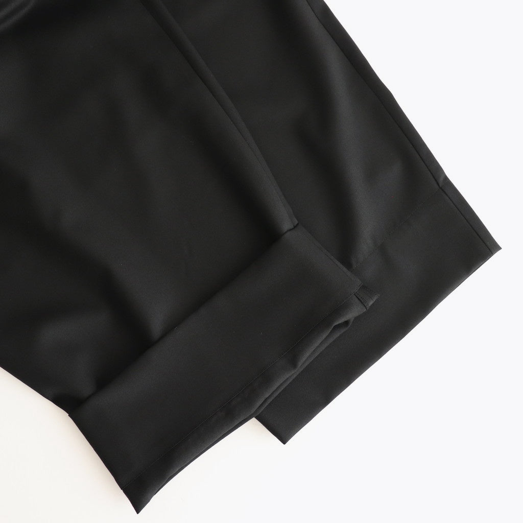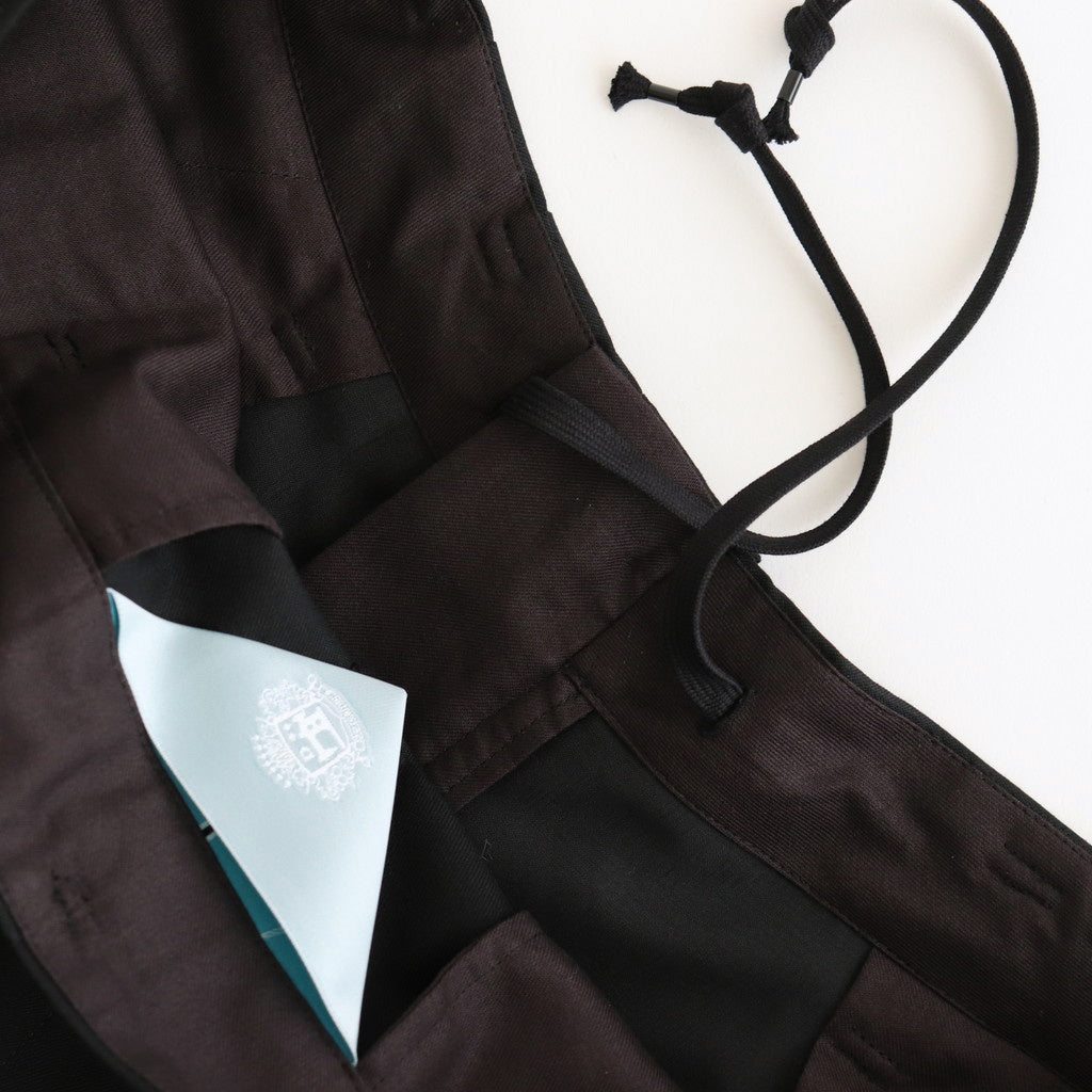 허리에 2개의 턱이 있어 볼륨감 있는 와이드한 실루엣을 연출합니다. 밑단에 살짝 테크를 준 와이드 스트레이트 타입으로 제작되었습니다. 양 사이드에 슬래시 포켓, 뒷면에는 플랩이 달린 포켓이 배치되어 있습니다. 앞면은 지퍼 플라이입니다.