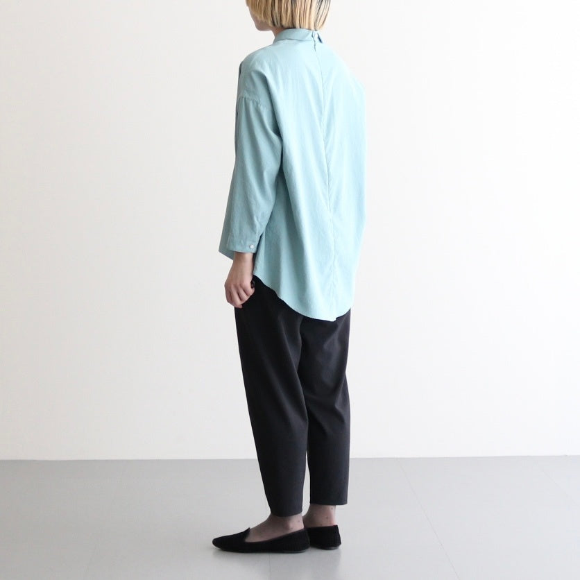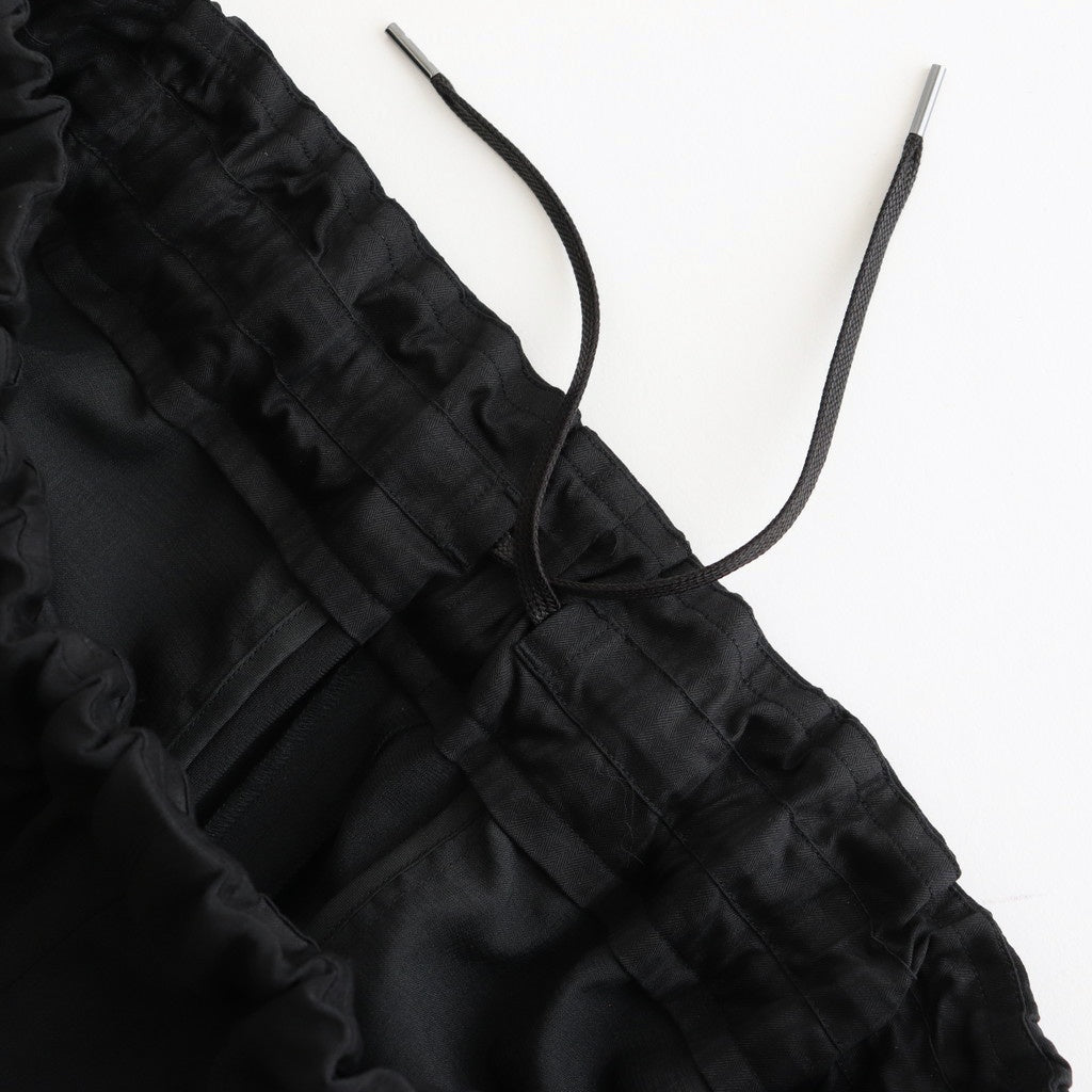 裾に掛けて強く絞りを入れたテーパードイージーパンツ。フロントにはウエストのゴムによるギャザー、独自のパターンと脇ハギを無くすことで丸みのある綺麗なシルエットを表現。レングスを9分丈に設定しているため、ウエストの位置を調節してシルエットのアレンジが可能。フロントにスラッシュポケット、ウエストはドローコードが通ったイージー仕様。