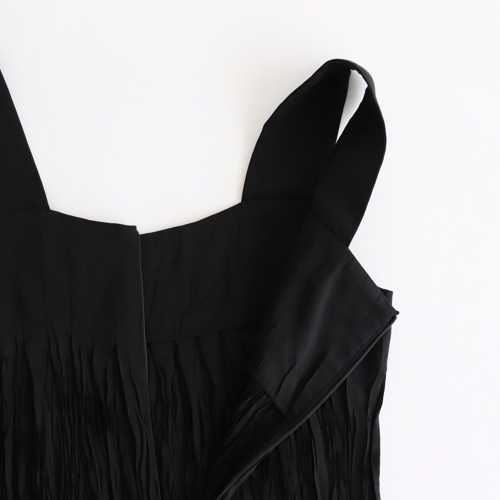 가슴 부분의 넉넉한 턱이 특징인 풀 렝스 점프수트. 턱과 원단의 주름 가공으로 넉넉한 분량을 확보하여 착용했을 때 드레스처럼 보이는 한 벌이다. 어깨와 목 주위의 면적을 세밀하게 조정하여 한 장으로도 착용할 수 있는 가슴 부분의 개구부가 특징입니다.
