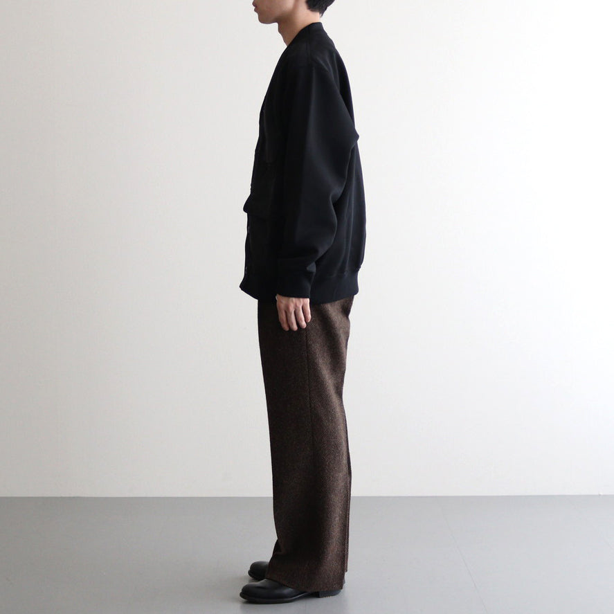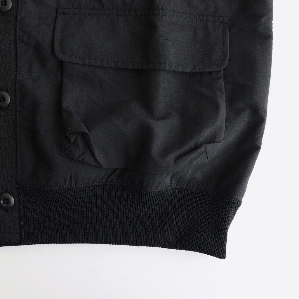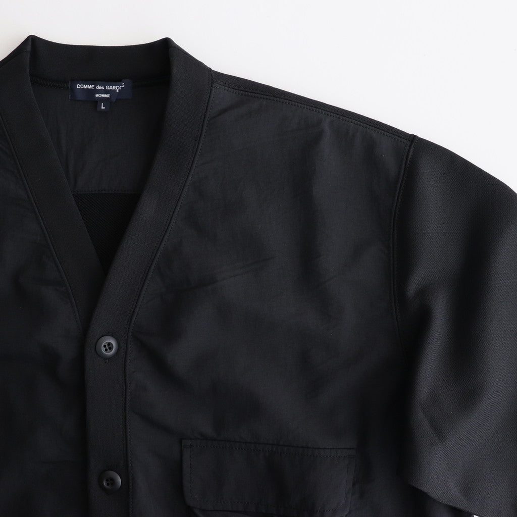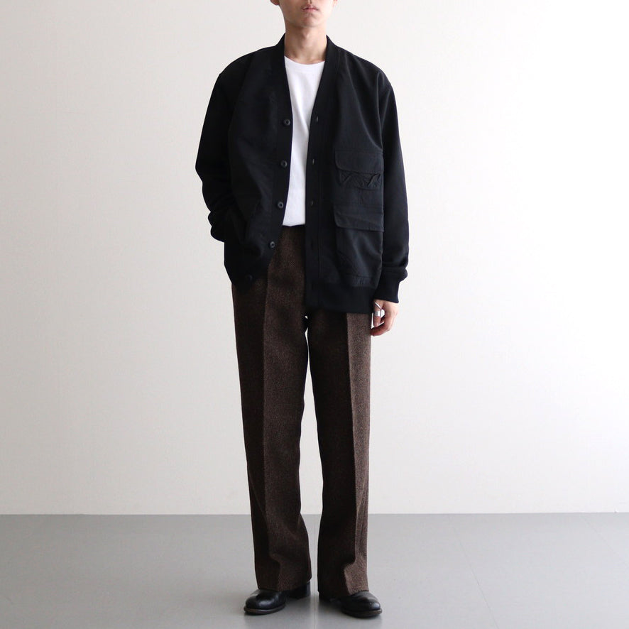 ゆったりとしたリラックスシルエットで製作されたVネックデザインのカーディガン。肩幅身幅にほどよくゆとりを持たせたゆとりのあるシルエットで製作。前身頃にはナイロン生地を貼り、ミリタリーライクなフラップポケットを3つ設計することで全体のデザインを引き締めていてます。