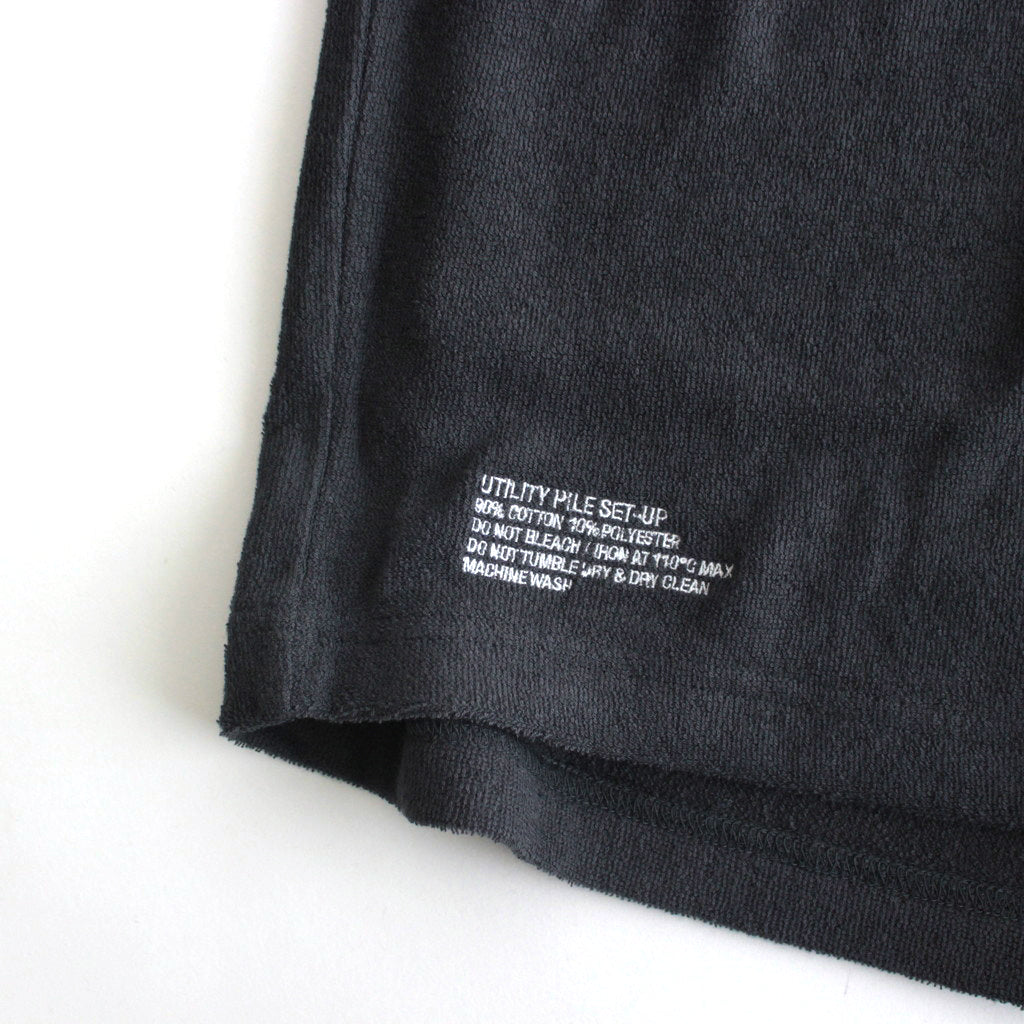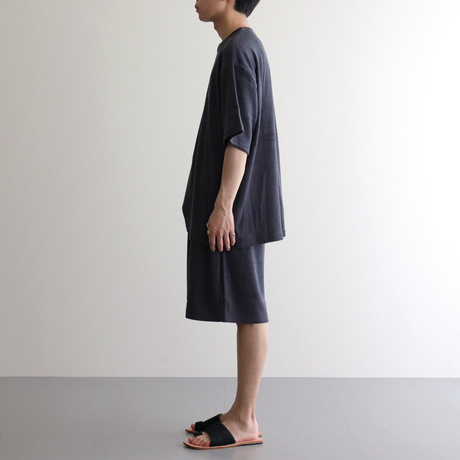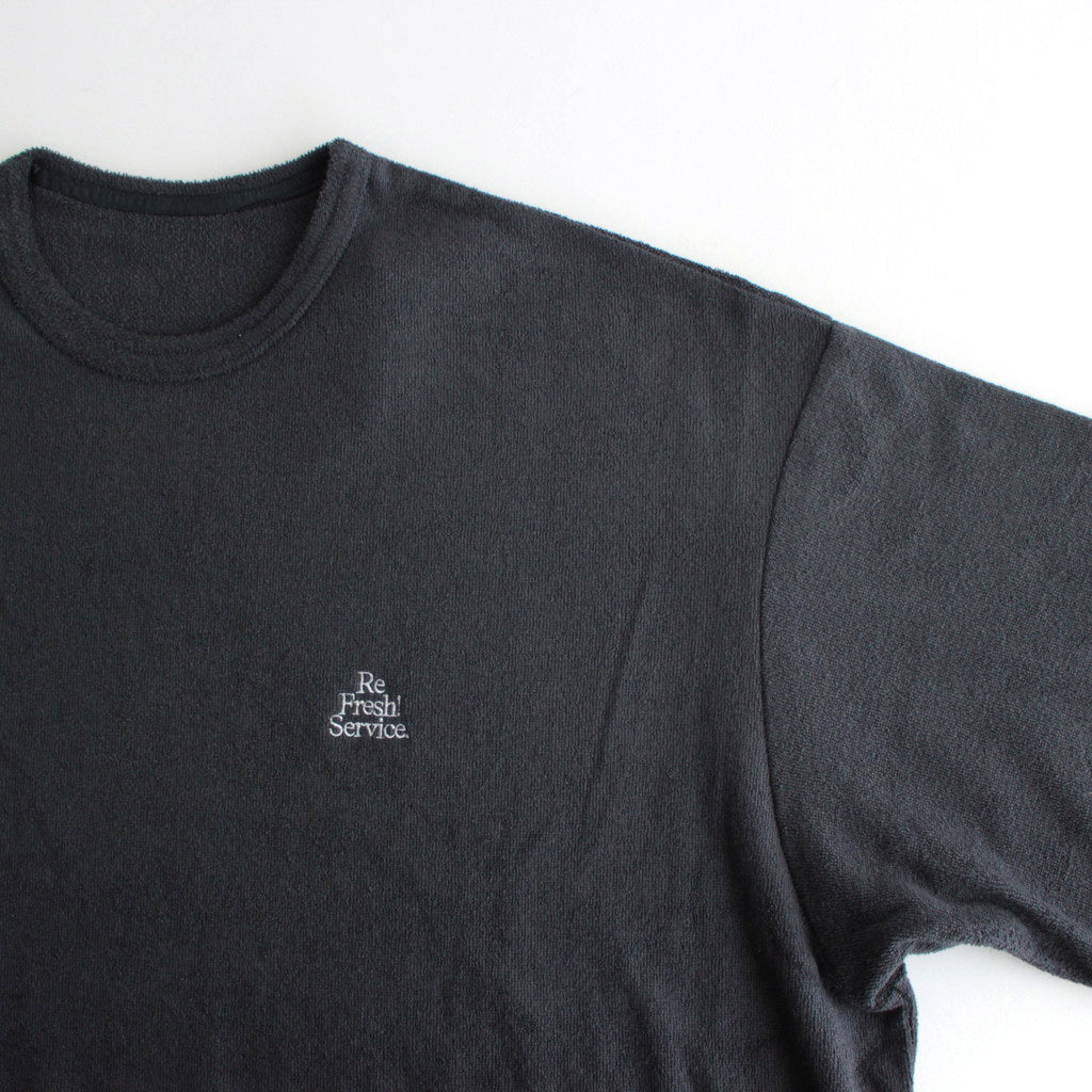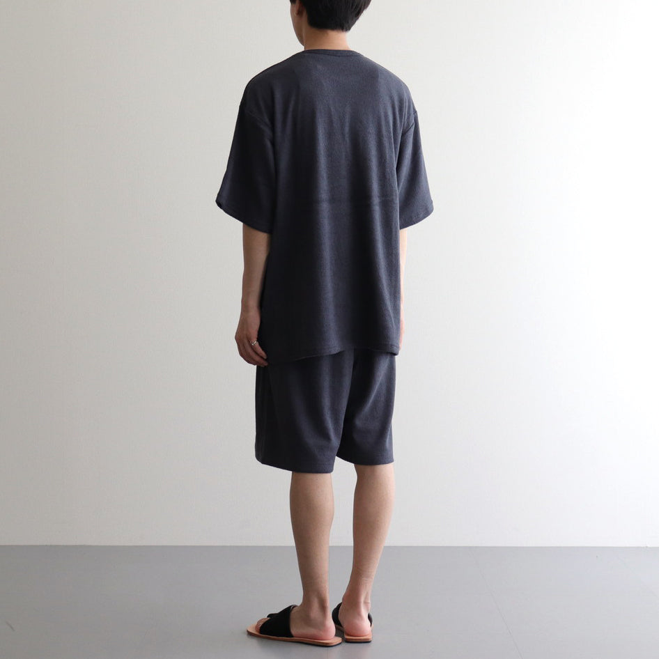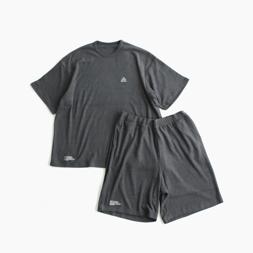 柔らかな肌触りでリラックス感溢れるパイル地を使用したReFresh!Serviceの半袖とショーツのセットアップ。採用したパイル地は吸水性に優れており、サウナから上がった後にそのまま着用可能。速乾性も兼ね備えており快適な着用感を維持します。