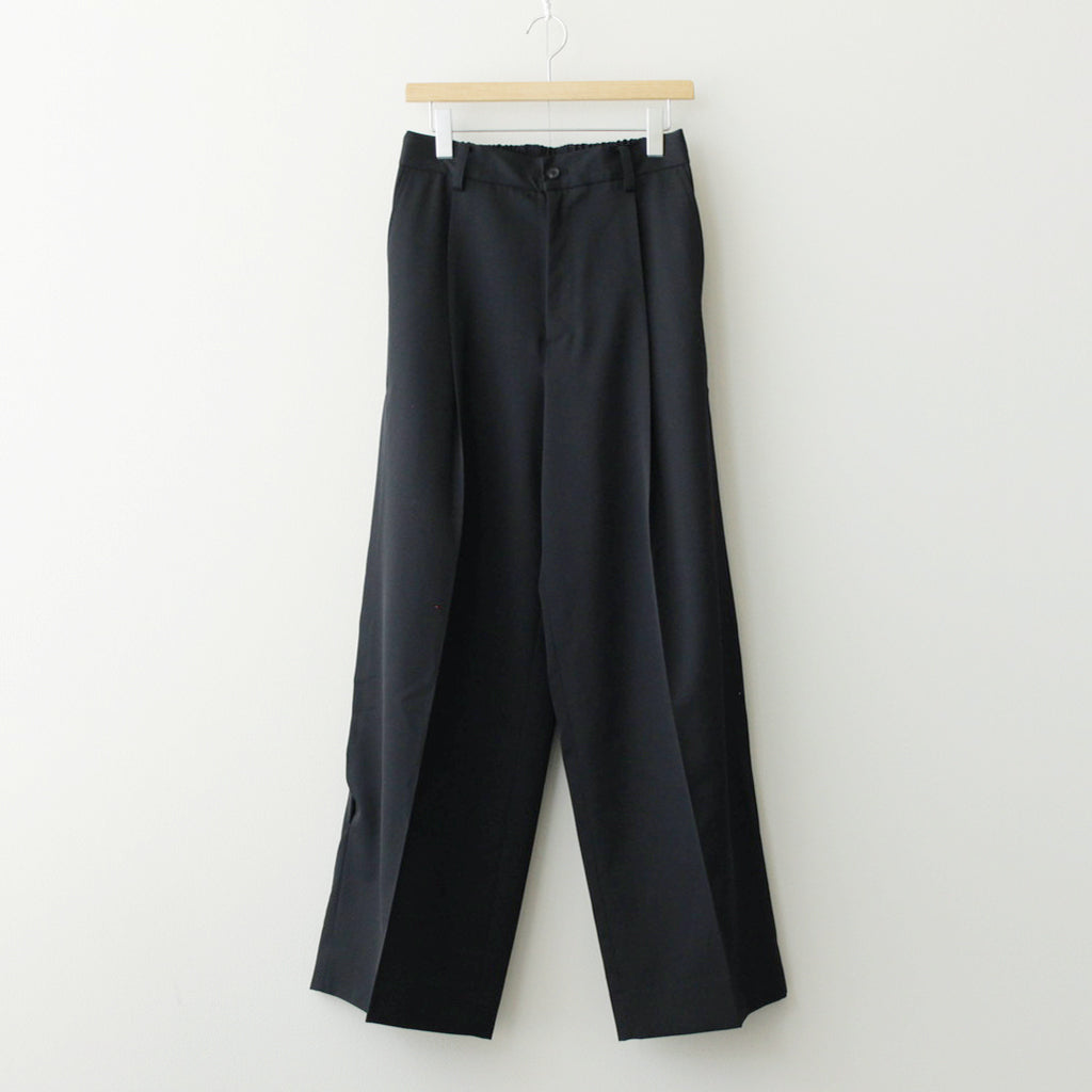 サイドシームの中腹あたりに設計されたスリットが特徴的なイージー仕様のワイドトラウザーズ。スリット部分は生地を重ねることで歩行中やひざを曲げた際にのみ肌がのぞく仕様になっています。イージー仕様のため、幅広いフィッティングが可能。様々なウエスト位置で着用可能な所も嬉しいポイント。