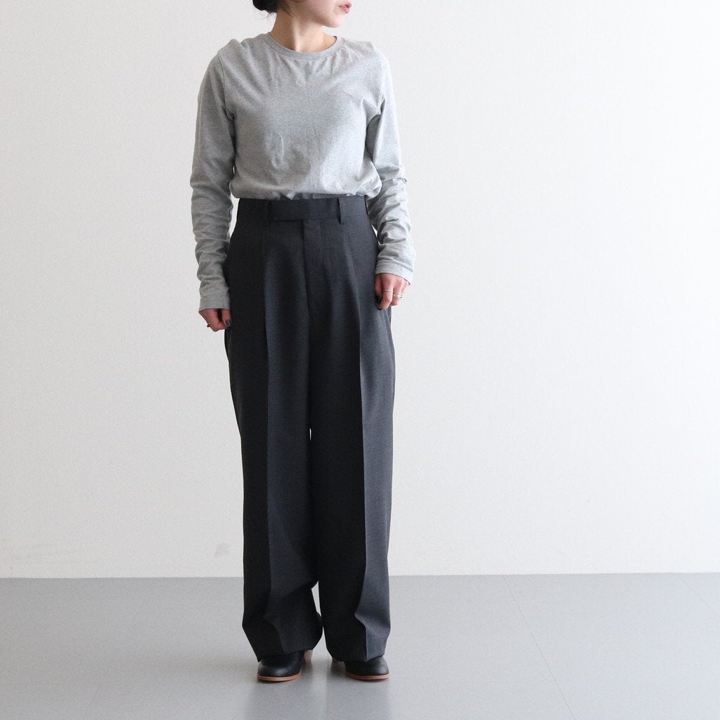 深いタックが入った迫力のあるワイドシルエットのスラックスです。フロントはYKKファスナーを採用したジップフライ仕様。腰の位置に実用性に優れたスラッシュポケット、バックは両玉縁ポケットを配置。フロントに深いアウトタックを入れる事で腰周りにゆとりを持たせ、程良いボリューム感を表現。太腿から裾までストンと落ちるような迫力のあるワイドストレートシルエットに仕上がっています。質の良さとシンプルなデザイン、シルエットの良さで長く愛用して頂けるAURALEEならではのプロダクトです。