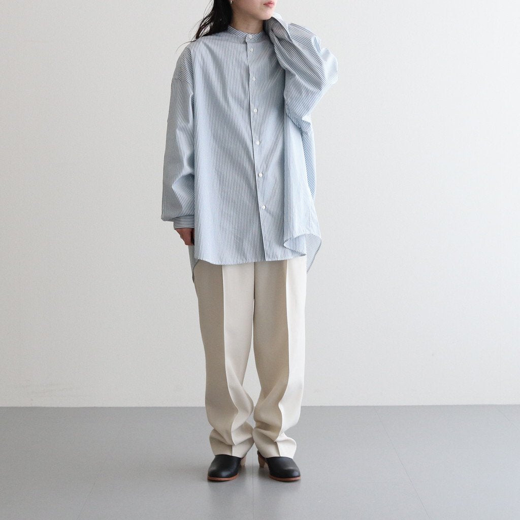 フロントはYKKファスナーを採用したジッパーフライ仕様。腰裏に別生地を貼る事で着用した時のフィット感を高めたり、シャツをインした時のズレを抑える役割を果たしています。腰の位置に実用性に優れたフォワードセットポケット、バックに両玉縁ポケットを配置。フロントに2つのアウトタックを入れる事で腰周りにゆとりを持たせ、程良いボリューム感を表現。ヒップ周りや太腿に程良いゆとりを持たせつつ、裾に掛けて緩やかに絞りを入れた、モダンで上品な印象のワイドテーパードシルエットです。