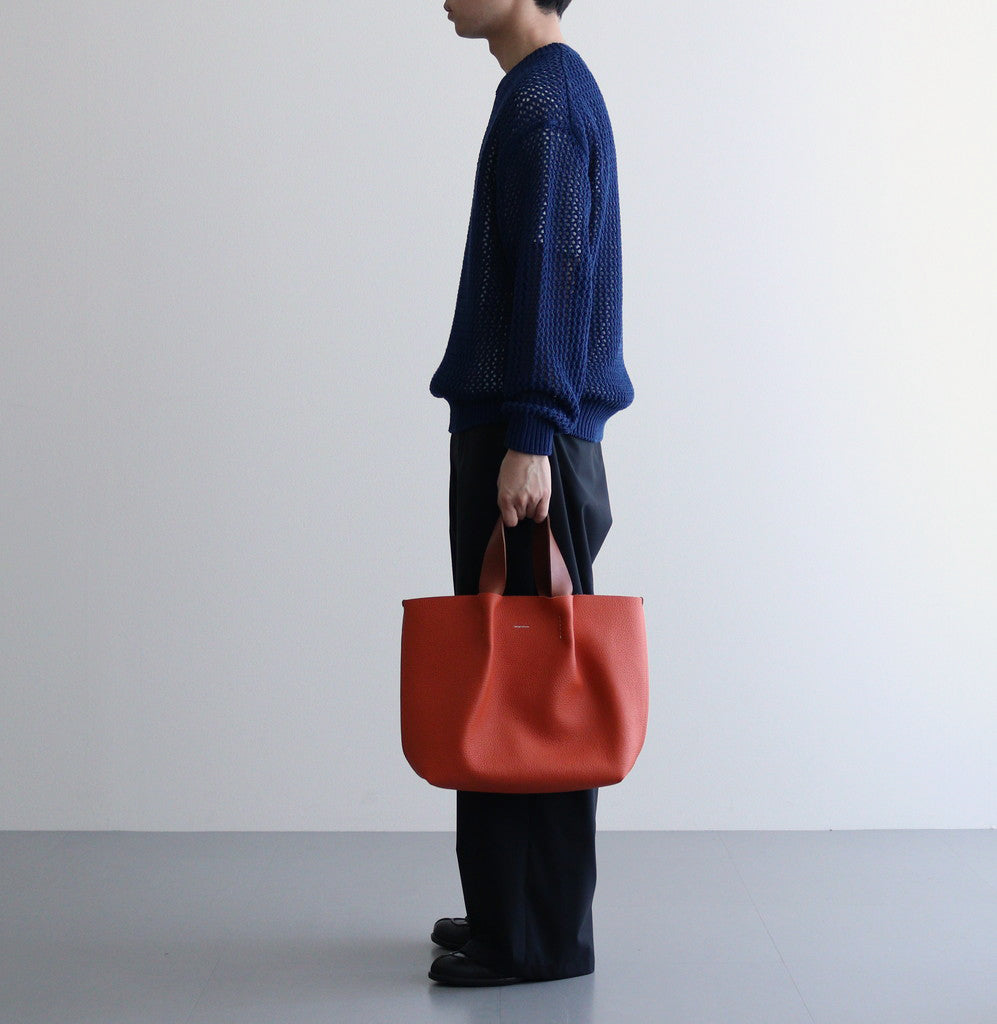 ゆったりとしたリラックスシルエットで製作された丸首のニット。袖をセットインスリーブ仕様にしたベーシックな作りの一着。透け感のある編地のためカットソーなどとの組み合わせを楽しめる仕様です。襟、袖、裾はリブ編みに切り替え、ほどよく丸みのあるシルエットに。
