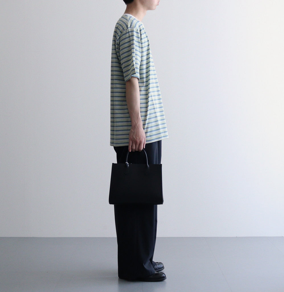 超強撚したコットン糸を使用したハイゲージのガーゼ生地を使用。斜行しないよう撚糸を加えた度詰めのコットン生地です。一般的なカットソーとは違い編み生地ではなく織りで仕立てられており、透明感のある色味とシャリ感のあるサラッとした風合いが特徴的。