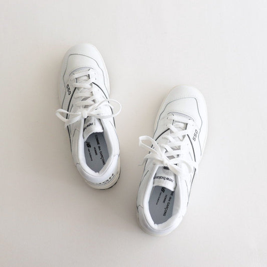 New Balance社の「BB550」をCOMME des GARCONS HOMMEがモダナイズした特別なスニーカーです。高級感のあるしなやかなステアレザーとメッシュをアッパーに、ヴィンテージ感を漂わせるソールを組み合わせたクラシックな一足。ブラックとホワイトのシンプルなカラーリングがより洗練されたシルエットを際立ててています。タンラベルに「550」、ヒールとインソールに両ブランドロゴを配し今回のコラボならではの特別感を演出しています。